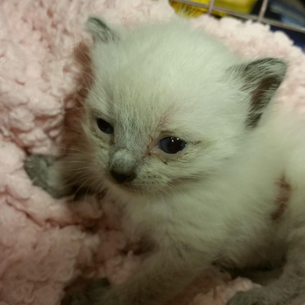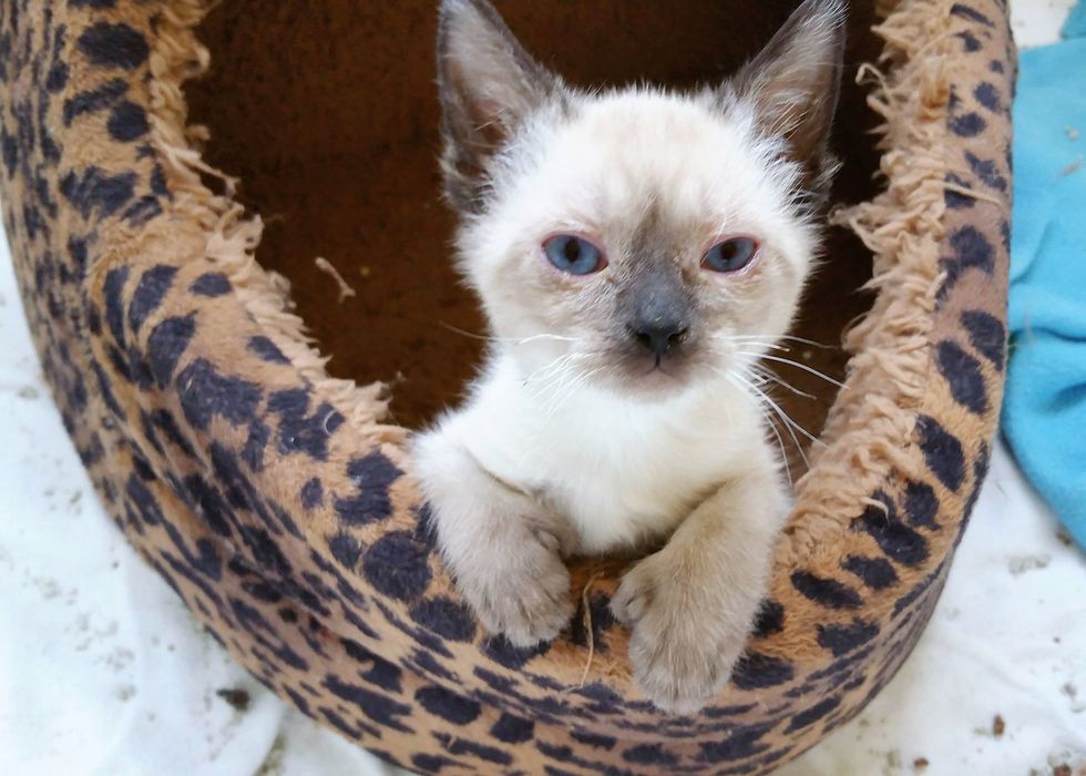 The kitten was just skin and bones when a feral colony trapper found her far away from the main area of the colony without a mother in sight. They quickly noticed her wounds which appeared to be caused by jaws or claws. For whatever reason, the kitten was dropped and survived.