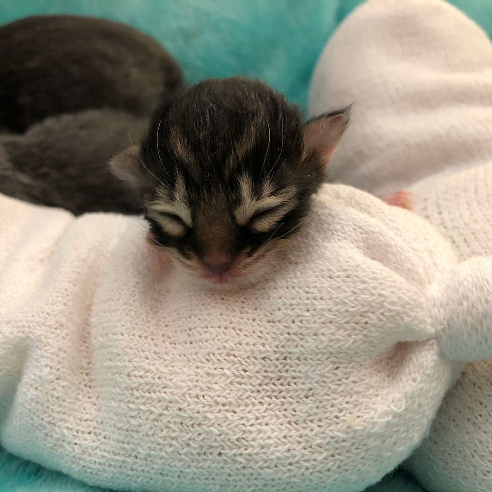Marti fed the kittens throughout that night and took them to work with her the next day. Nikki Martinez, an avid animal rescuer/foster based in Las Vegas, offered to help. "It was freezing that night and when she found them they were ice cold and stiff," Nikki told Love Meow. "They had not had their mother's milk which has essential antibodies. They had a lot against them."