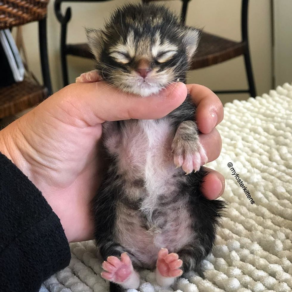 Slowly but surely, Bagel began to pack on weight and build up strength in her tiny legs. When she discovered her paws, she rolled on her back and was fascinated by those teeny mittens.