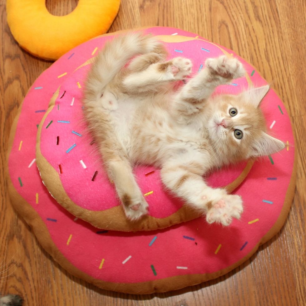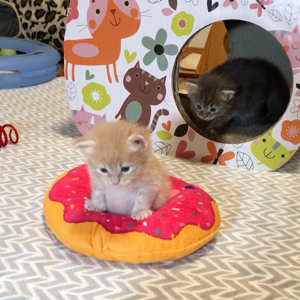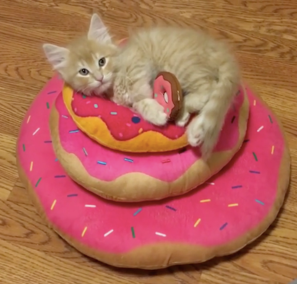 Then one day, his foster mom, Sheila (@Love2Foster), brought home some tiny doughnut beds made for young kittens. Stanley was in love.