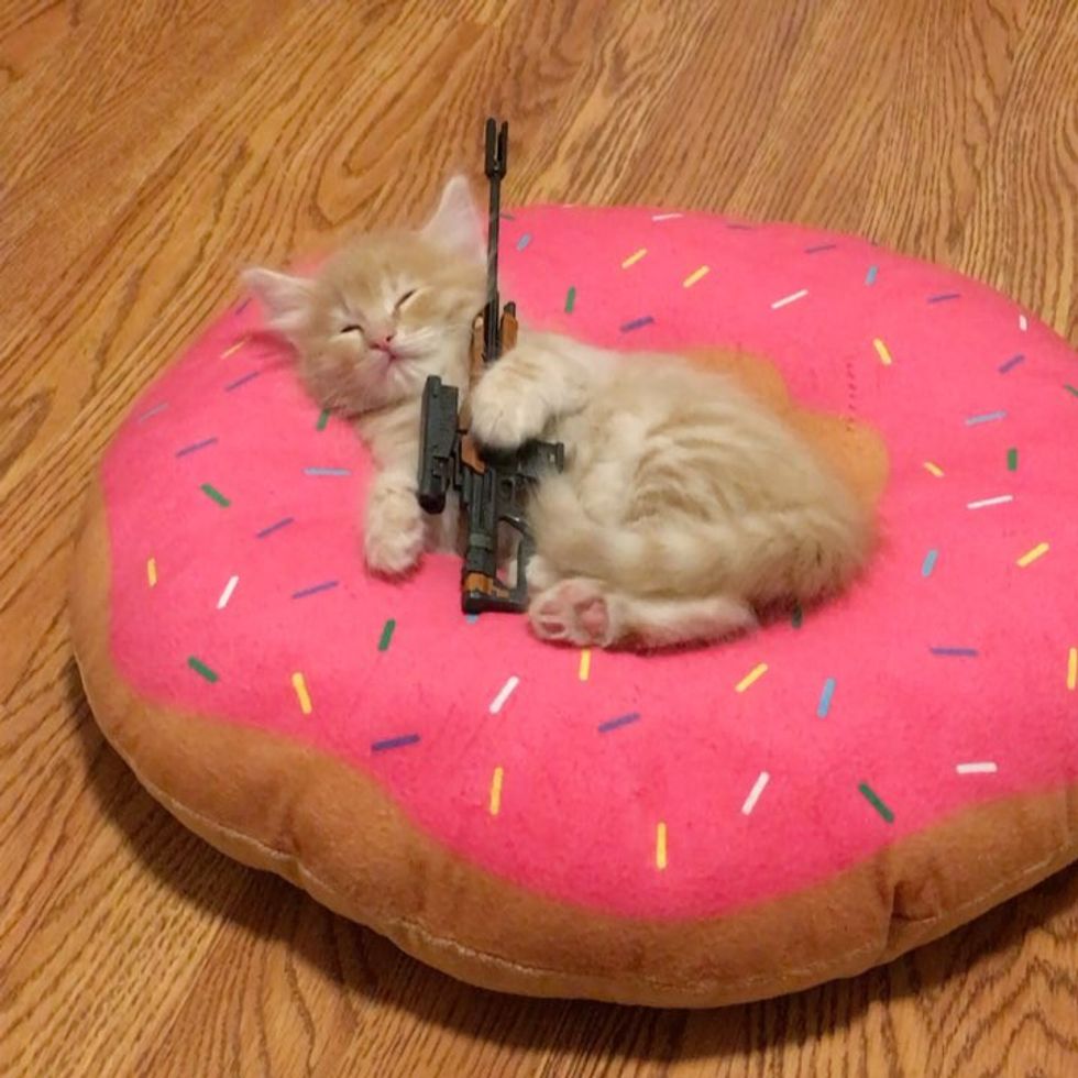 Stanley climbed to the top and laid down for a nap while holding onto his cuddly mini donut.