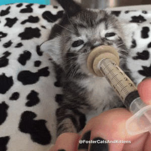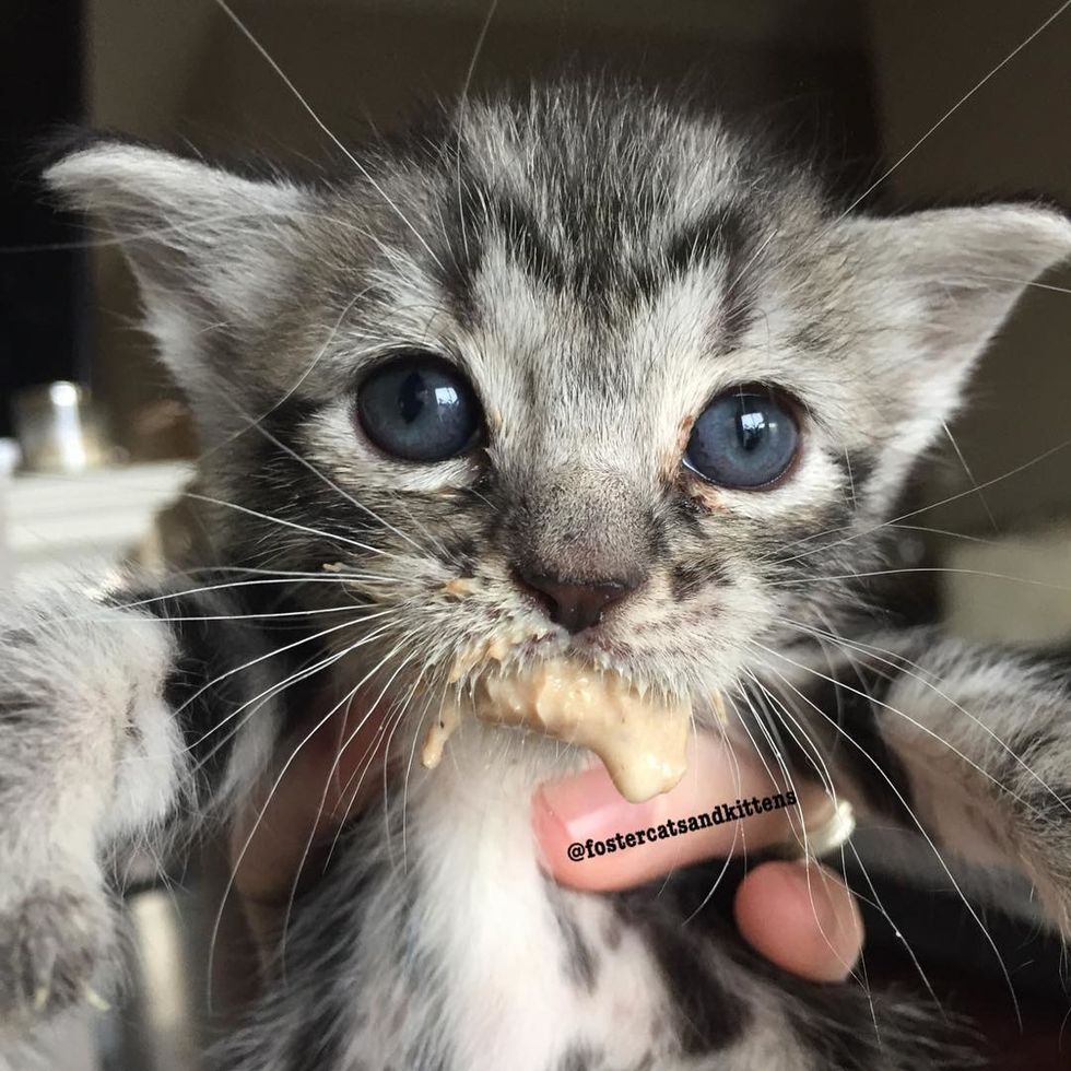 A few days ago, Foster had his first meal of solid food. "It takes him about half an hour to suckle down 1/4 can of wet kitten food. We are working on learning how to take actual bites."