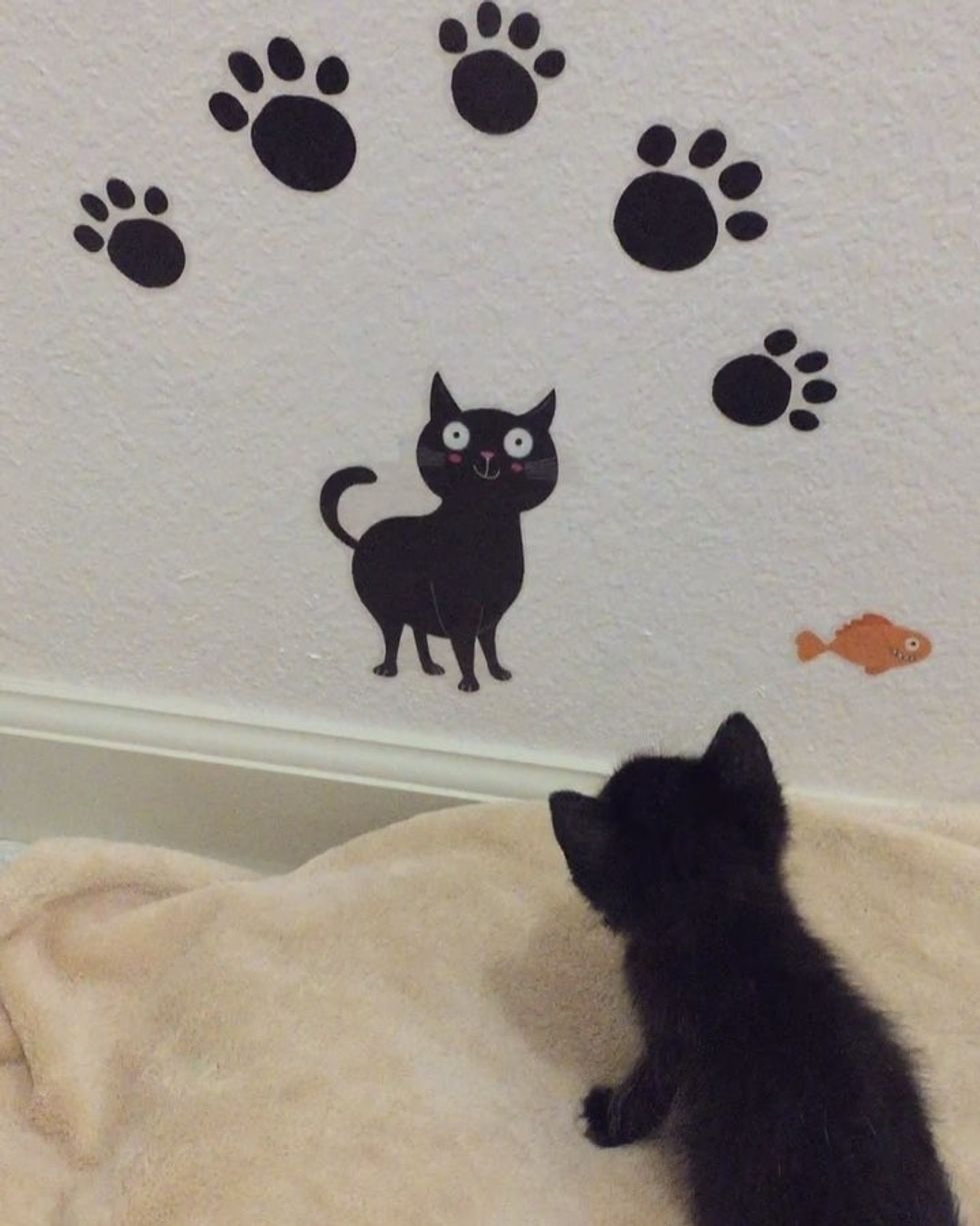 "She was actually looking at the wall stickers. It is beautiful how the kitty down below has a sweet little smile."