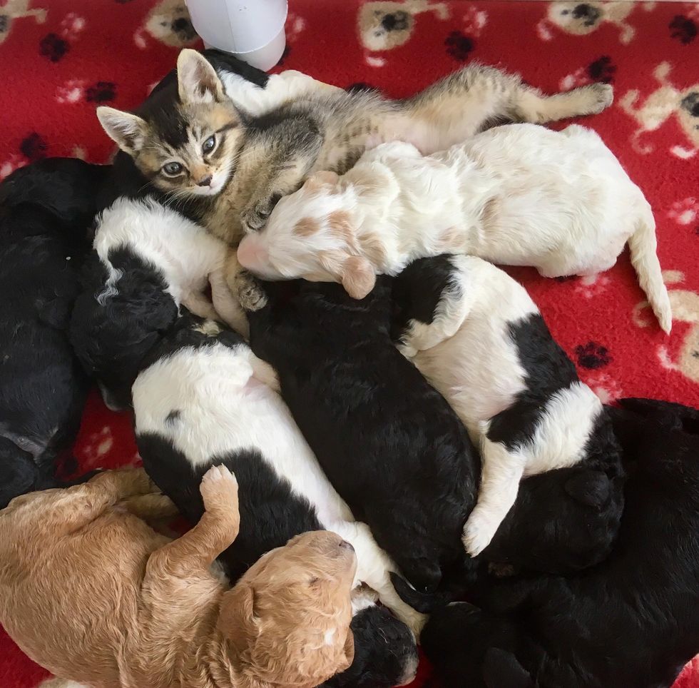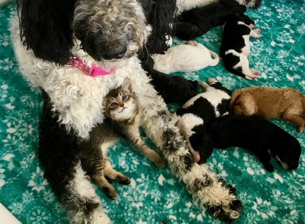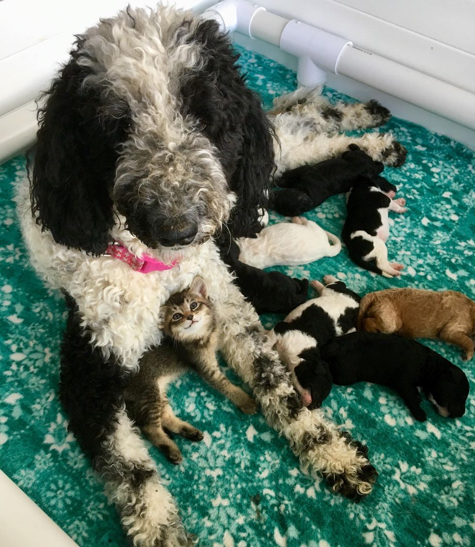 "The pups still had their eyes closed so they didn't know any different. They snuggled in and she loved it."