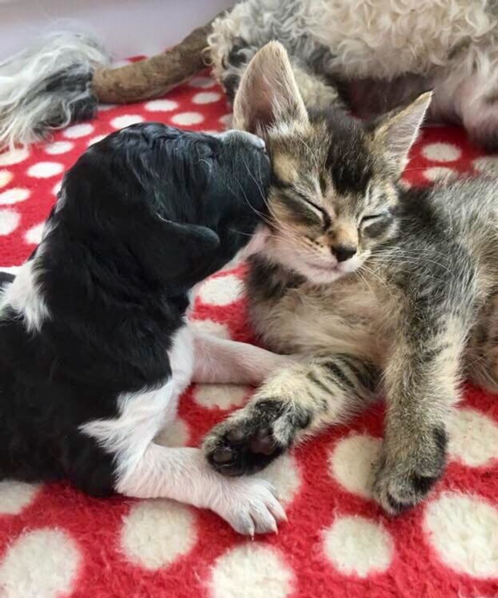 An orphaned kitten came to the shelter in need of motherly love. A cat and a dog offered a helping paw.