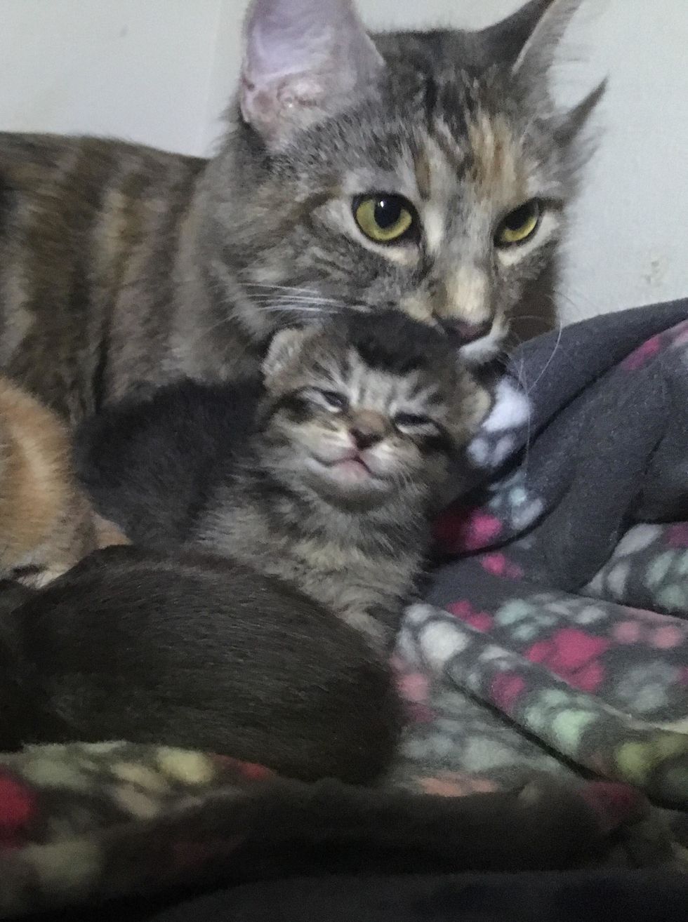 Maddie gave birth to nine kittens, but only four survived. When she was introduced to Nala, she took her right in and started caring for her as if she was her own.