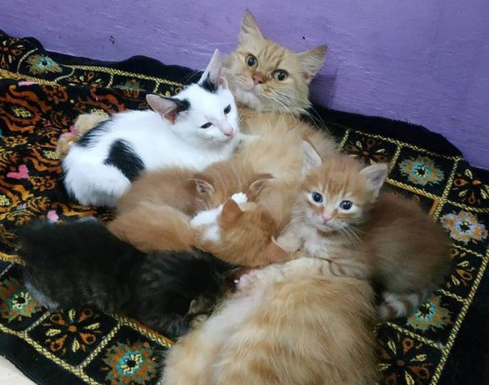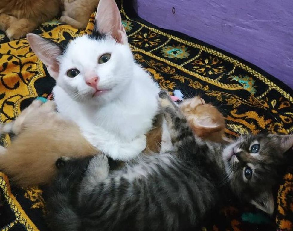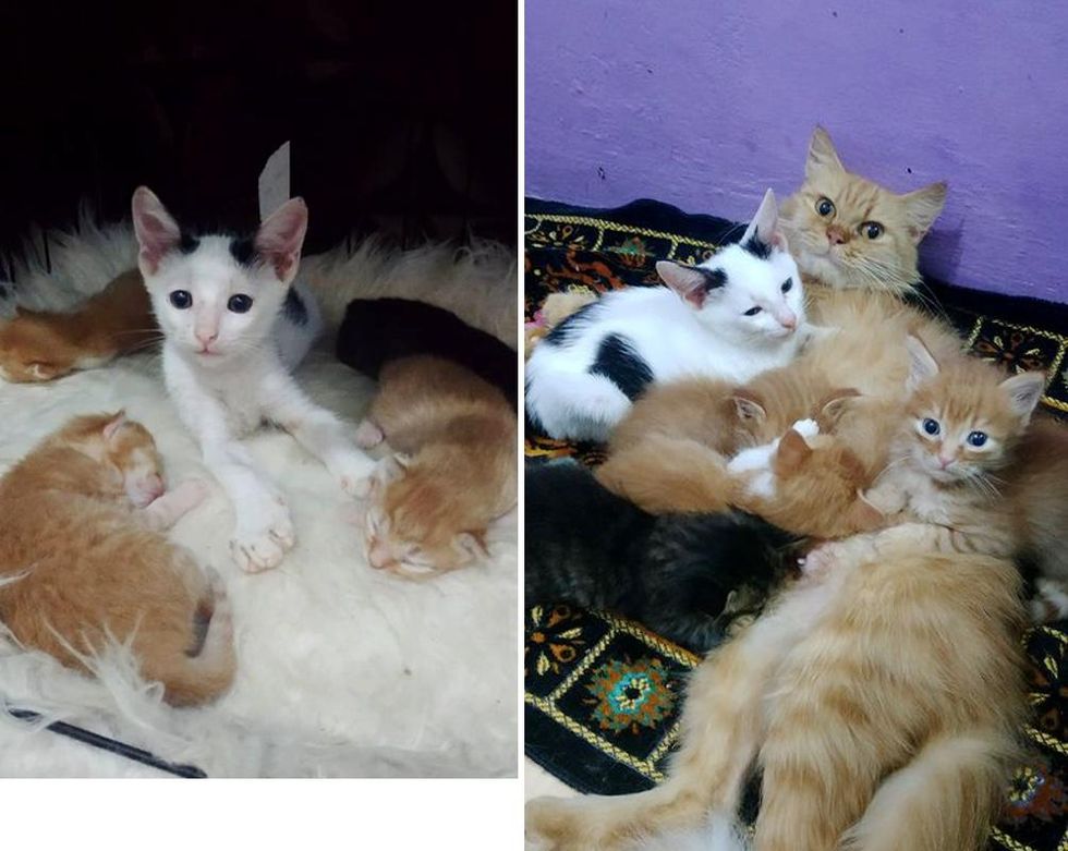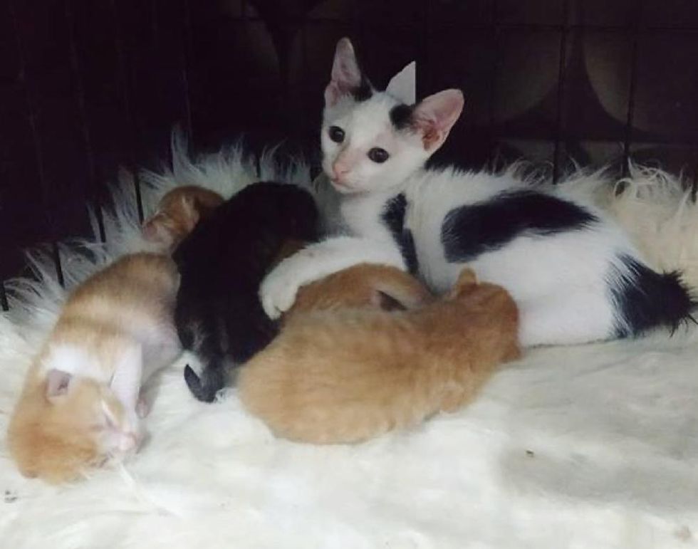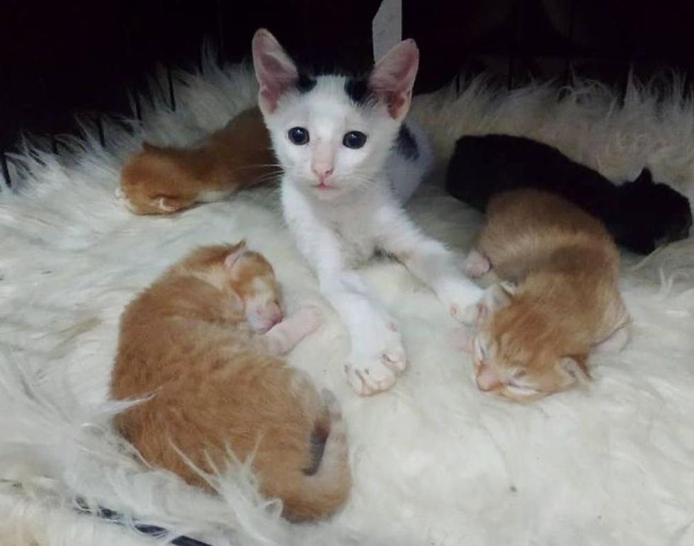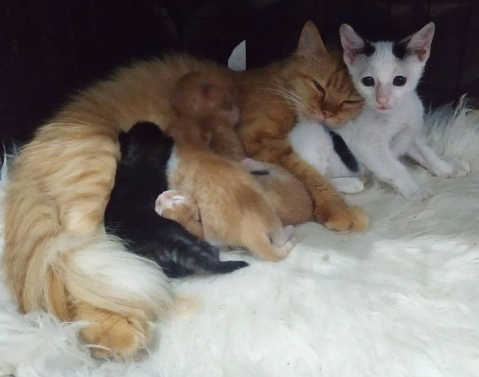 A few weeks prior to the kitten's arrival, Bella took in a pregnant cat who had been found abandoned outside. She later gave birth to a litter of four in the comfort of a warm nest, away from the elements of the outdoors.