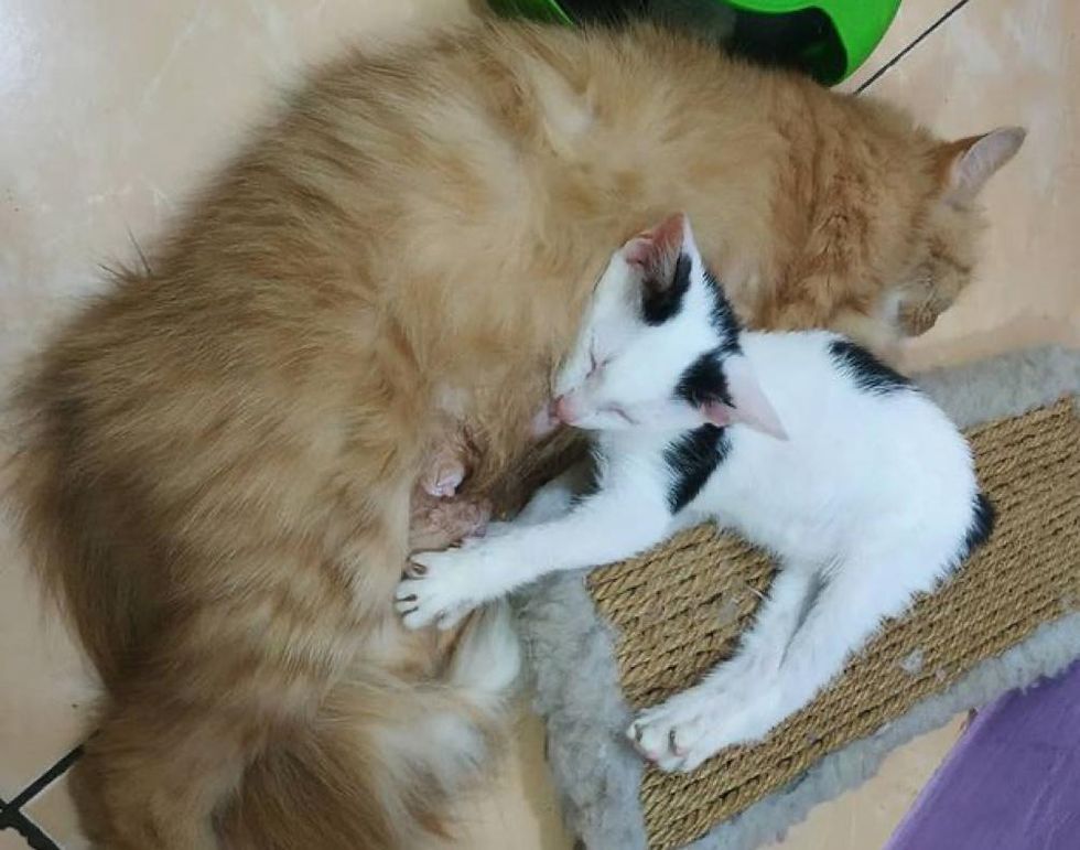 Mama cat Yu-na didn't mind the little newcomer and welcomed him into her family with a bath and snuggles.