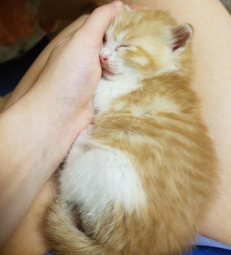 The kitten was just three weeks old, and fit perfectly in the palm of her hand. They couldn't find the mother cat and the ginger boy was in desperate need of round-the-clock care.