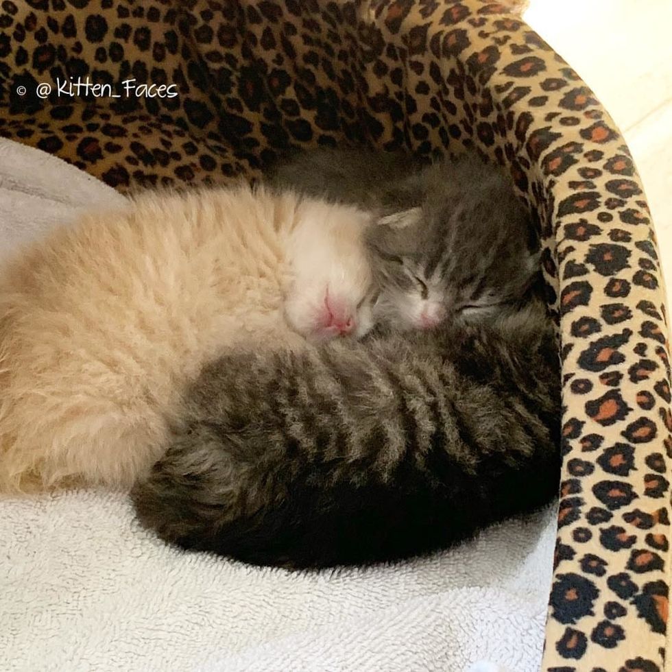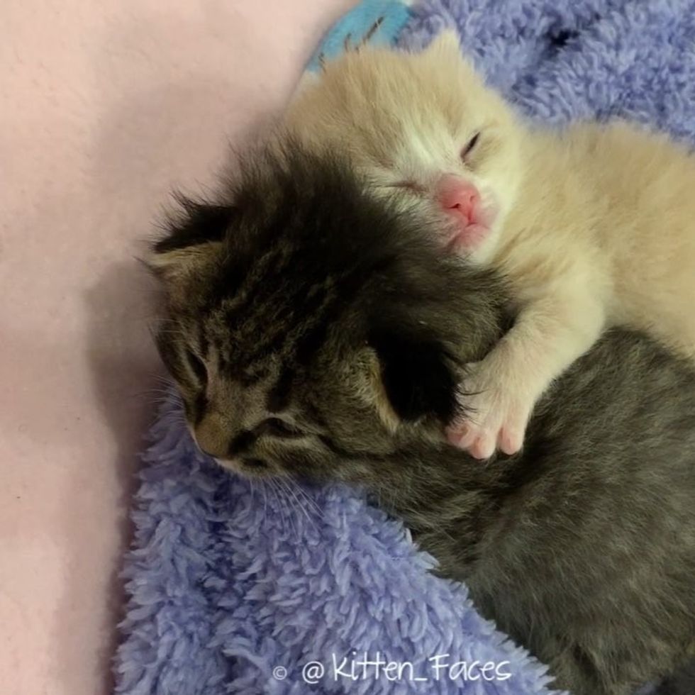 A little kitten who lost his sibling, found two bigger kitties to cuddle with. It turned his life around.
