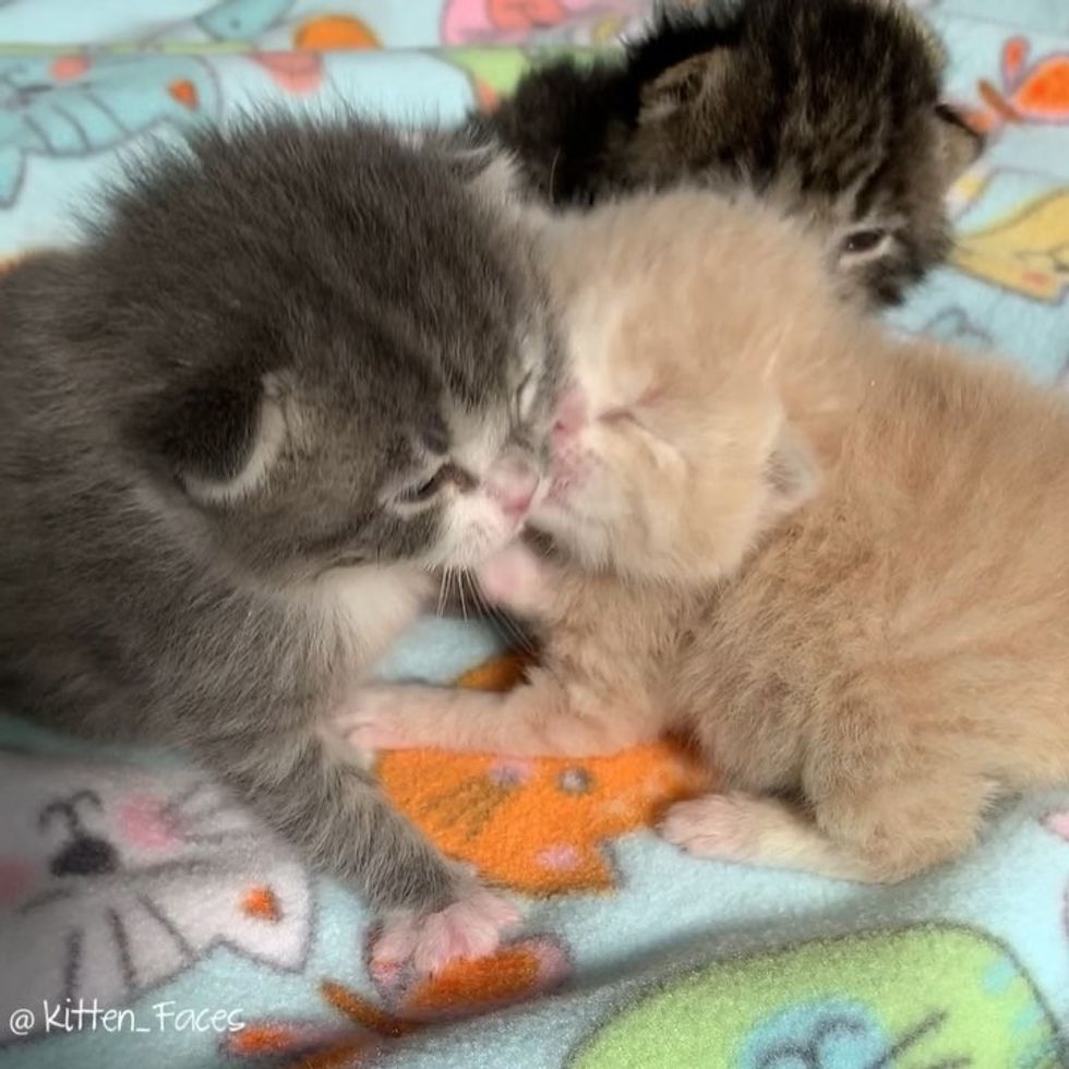 When they were ready to meet Lionel, the two bigger kittens snuggled right up to their new brother.