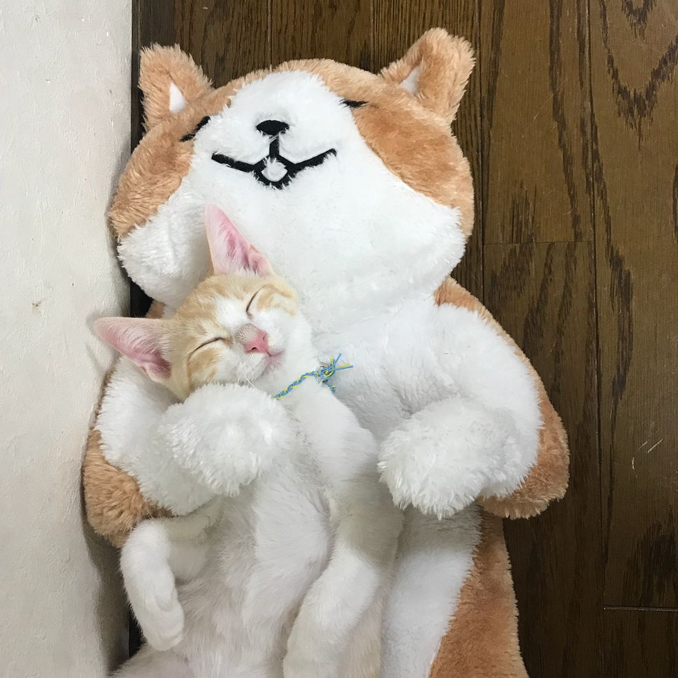 When Haku saw the big kitty, he immediately started kneading on it and eventually curled up in its arms for a nap.