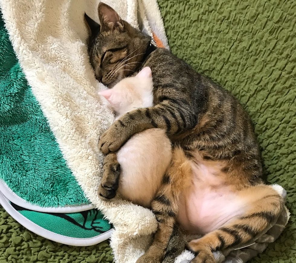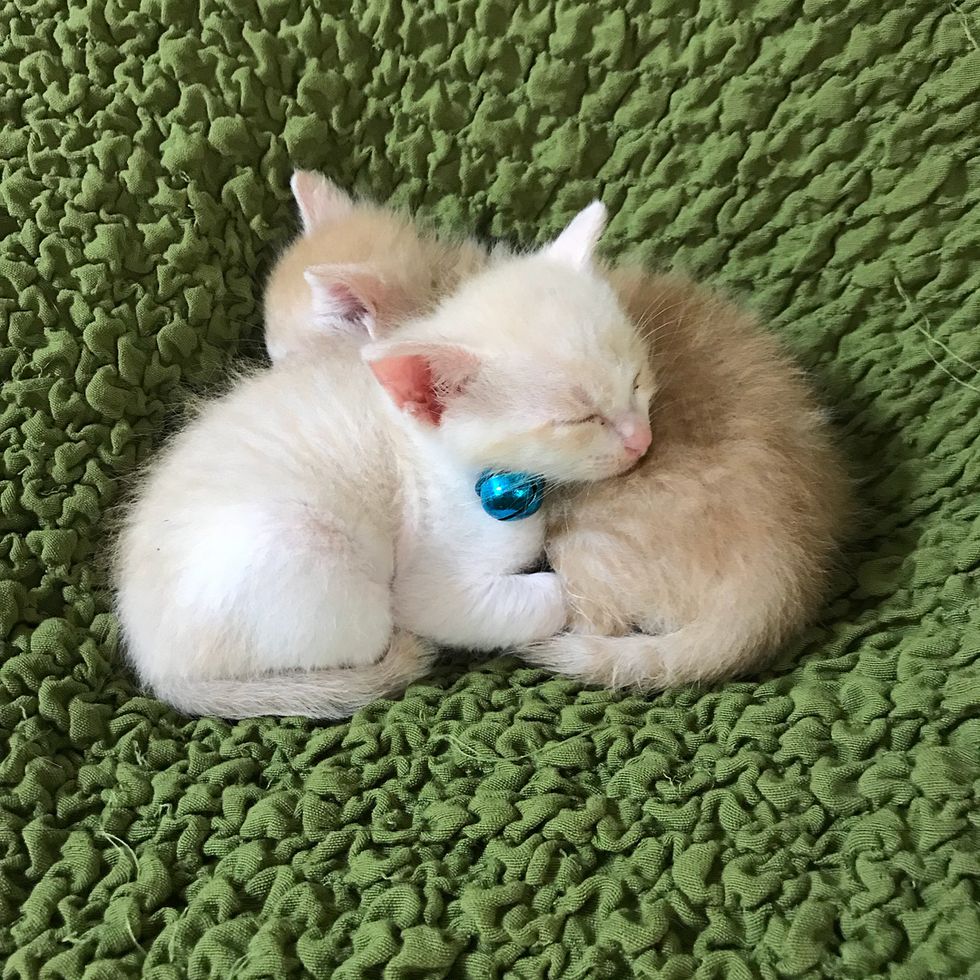 When he wasn't clinging to his sister, he was snuggling with their older cats. They took turns to keep him company and gave him love and comfort.