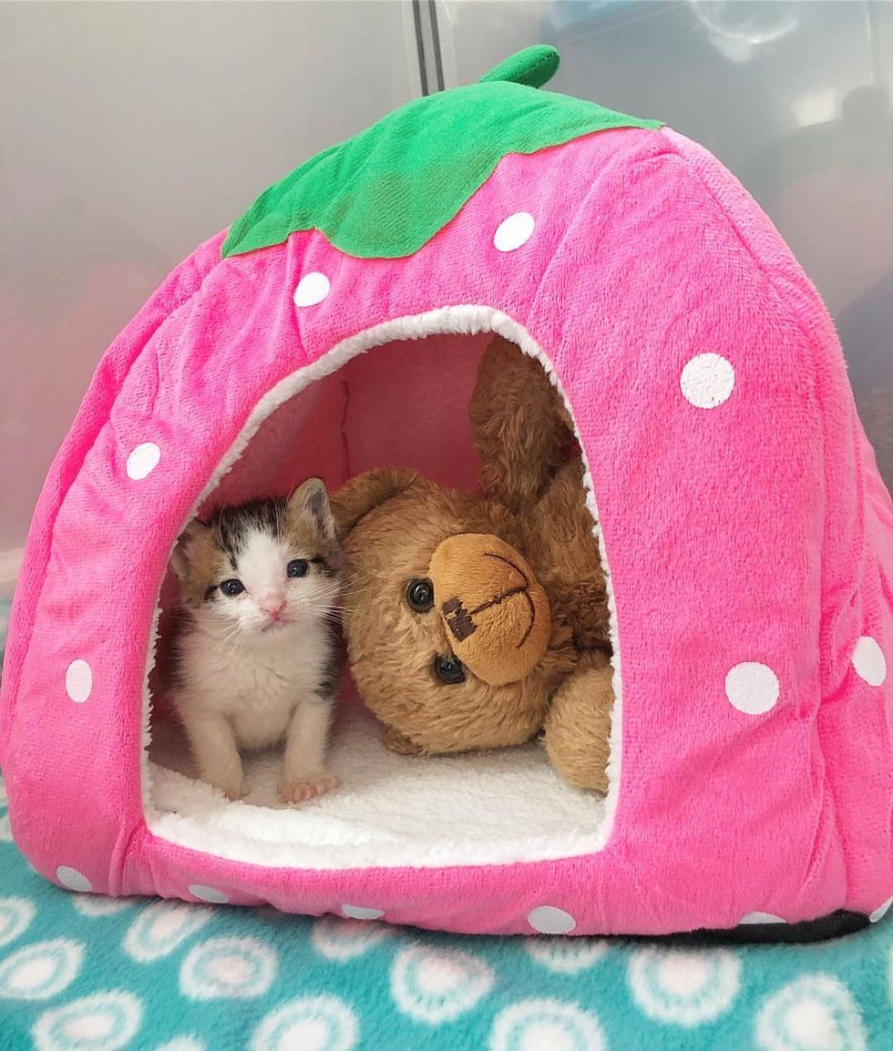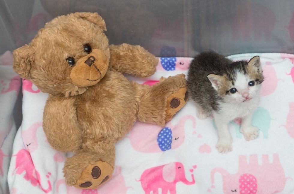 Hannah Shaw, founder of Orphan Kitten Club, took in the little kitty when he was on his last legs. He was very weak but hanging on with all his might. Hannah gave him a teddy bear, so he would not feel alone as he continued to fight through his illness.