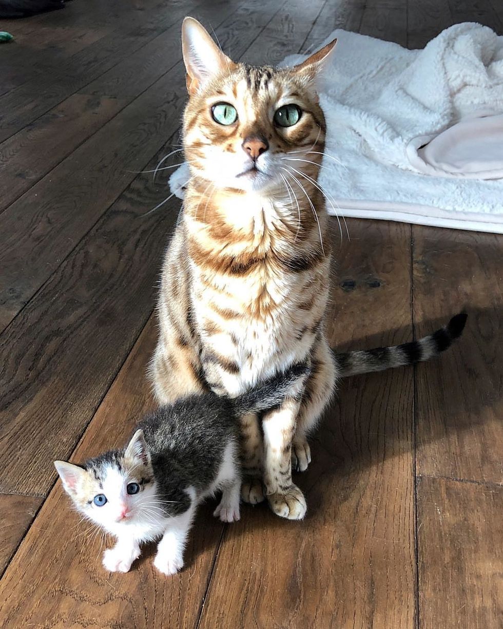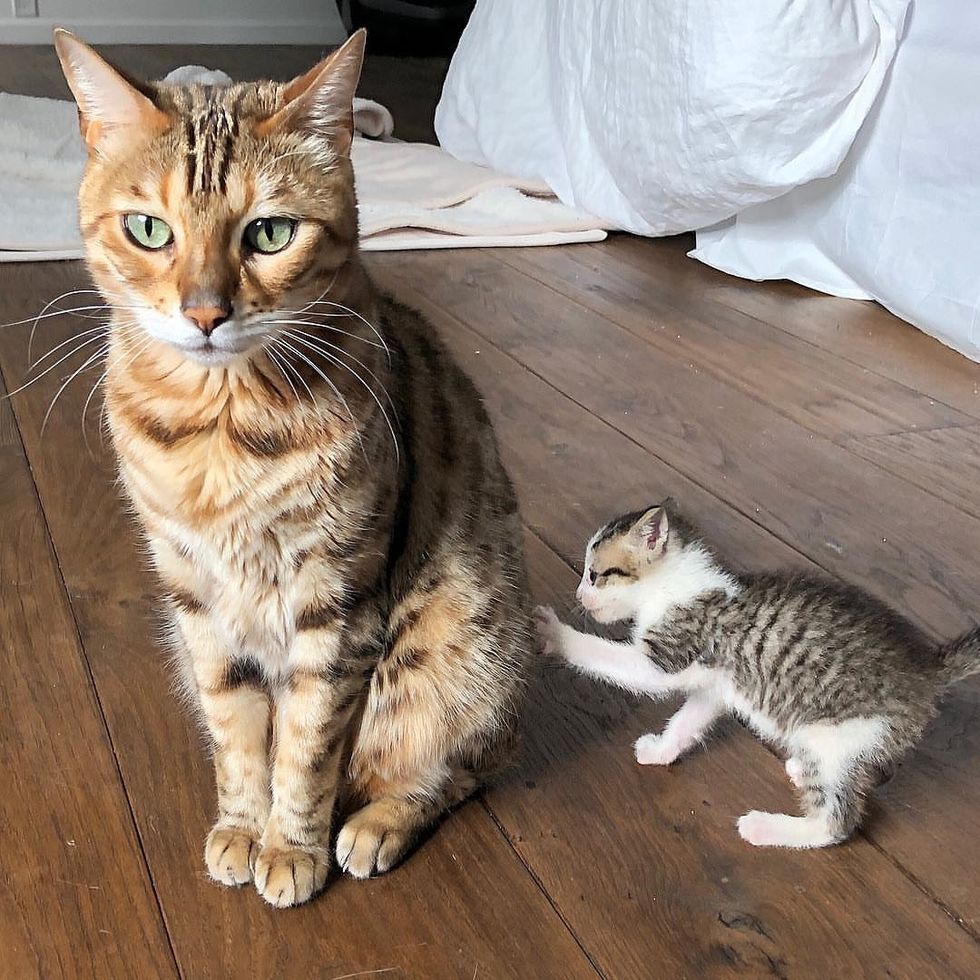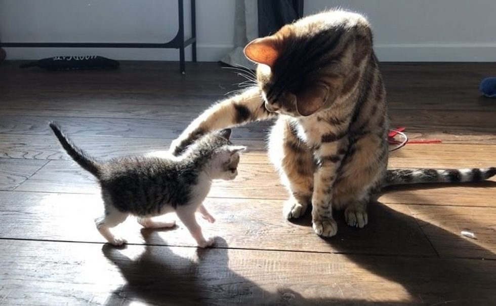 "He was too small to fit in with the big kids (other foster kittens), so we decided to try him out with Haroun the cat who has a solid track record of mentoring solo kittens.