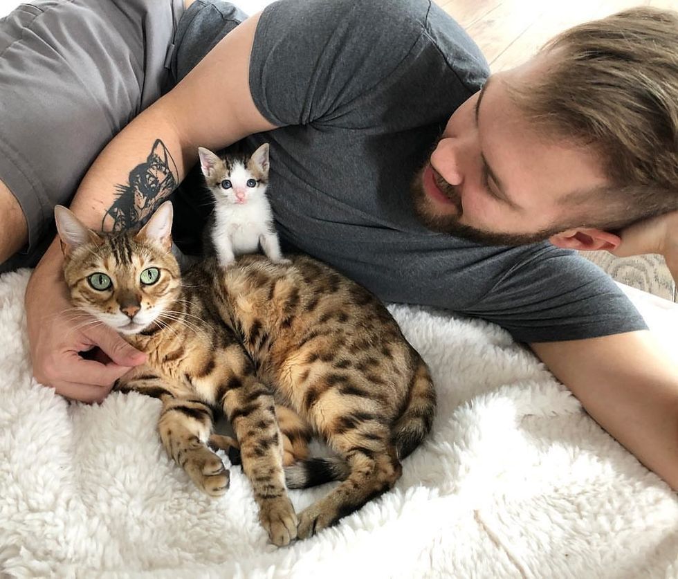 The kitten named Rey adores his teddy bear. He snuggles with it, falls asleep on it and hugs it like he would his own mom. The bear has been his great companion since day one, and he naps with it every night.
