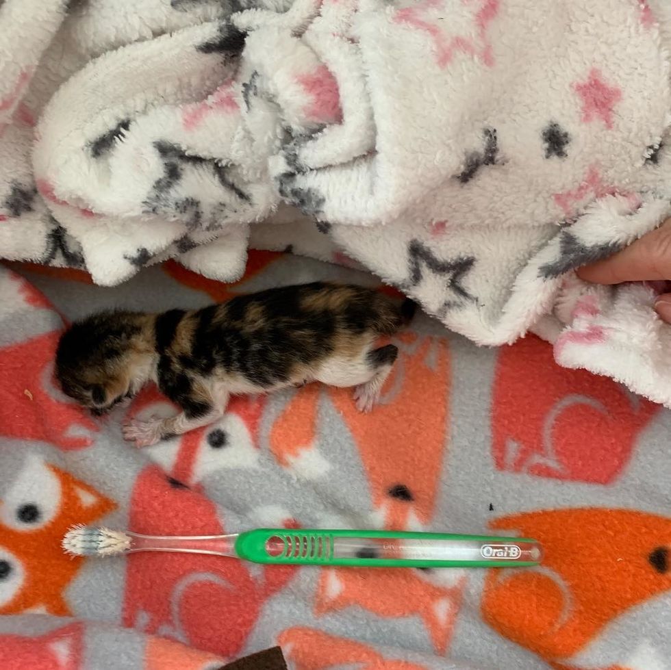 They named her Pudding, and she was smaller than a tiny toothbrush. "She loves her food and gobbles it all down. She doubled her weight in a couple of days."