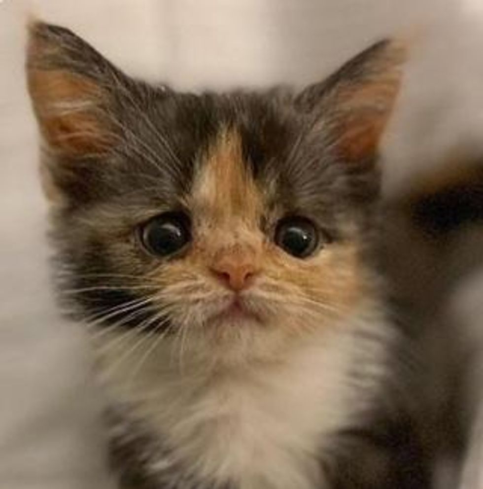 The little preemie has blossomed into a gorgeous calico with a beautiful fluffy coat and a larger-than-life personality.