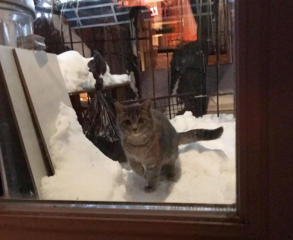 Amongst them, there was a gray kitten who saw Celine's house cat through the door, and was intrigued enough to approach her. She trekked all the way to the door and placed her front paws on the window, trying to peek in.