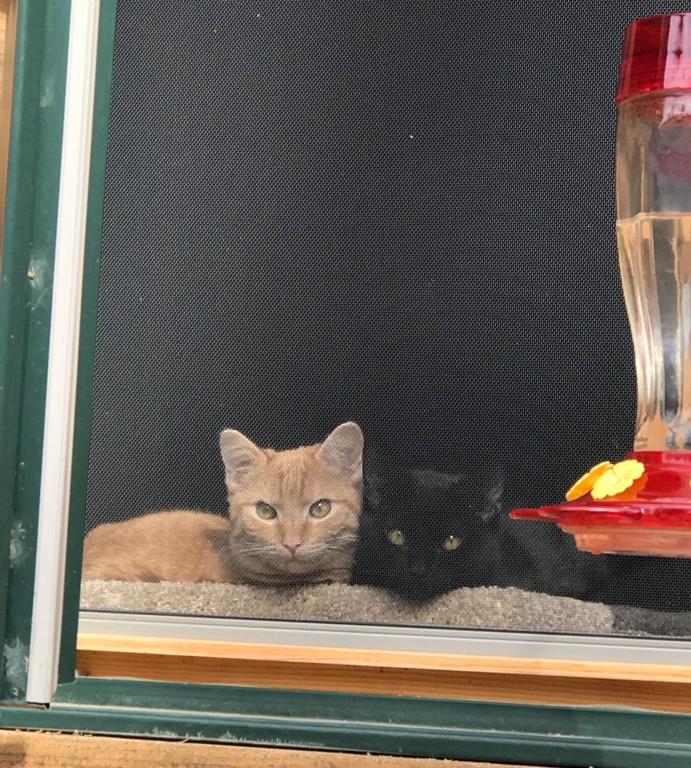 Phoenix and Ash love to watch the hummingbird TV together by the window.