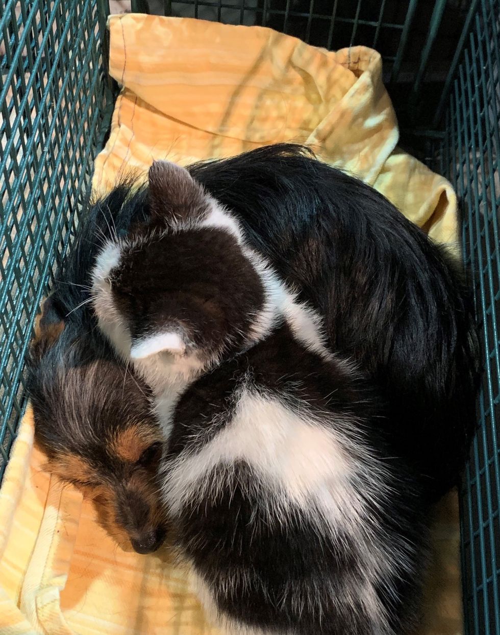 A kitten and puppy were found wandering the streets together. They never leave each other's side.