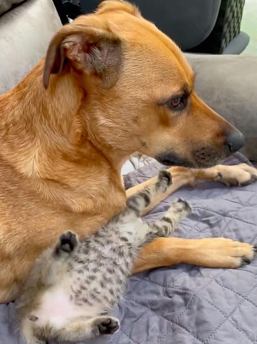 The little fluff ball took to Nood right away and nuzzled into her warm belly. The sweet canine was over the moon to have another kitten to look after.