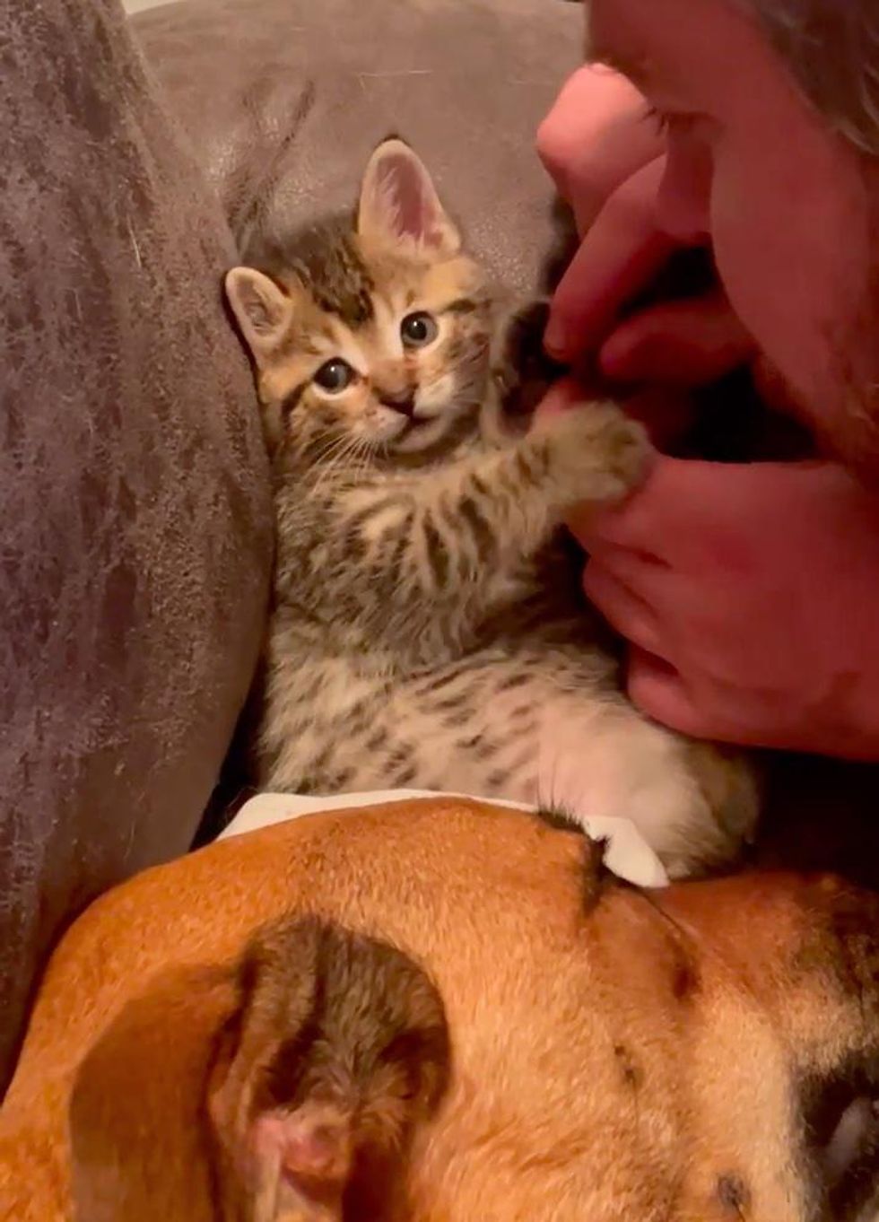 A kitten who was found all alone, is over the moon to have a big family to dote on her.