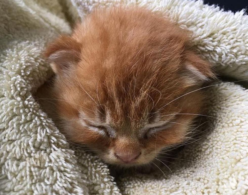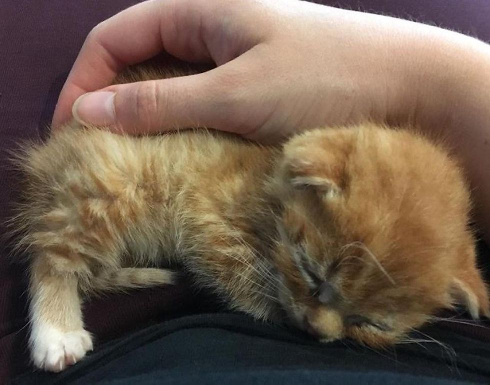 Penny reached out to the finder and offered to help. When she got the kitten, she immediately noticed something different about the tiny bundle of fur. "He was very rounded, and a little oddly shaped for a kitten."