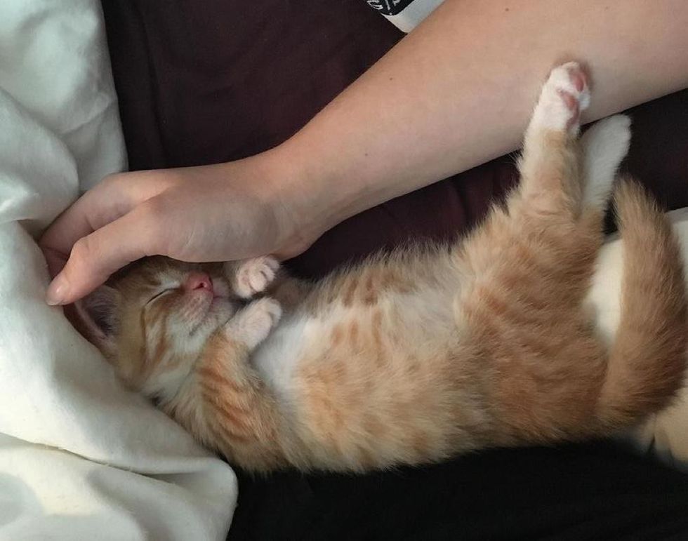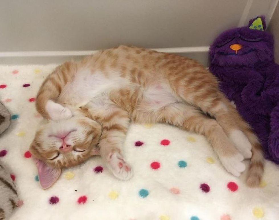 At night, he would nuzzle into his faux mama, the heartbeat cat, or curl up in the arms of his foster mom before purring himself to sleep.
