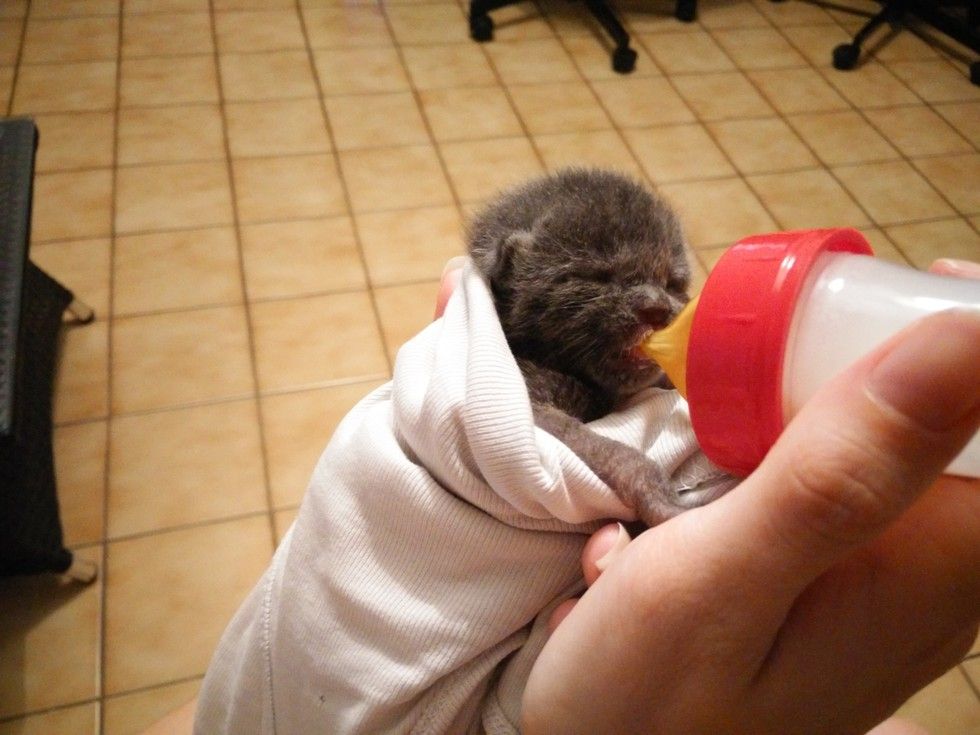 "After 24 hours struggling with a pipette she finally accepted to be bottle-fed! I fed her every 2 hours day and night."