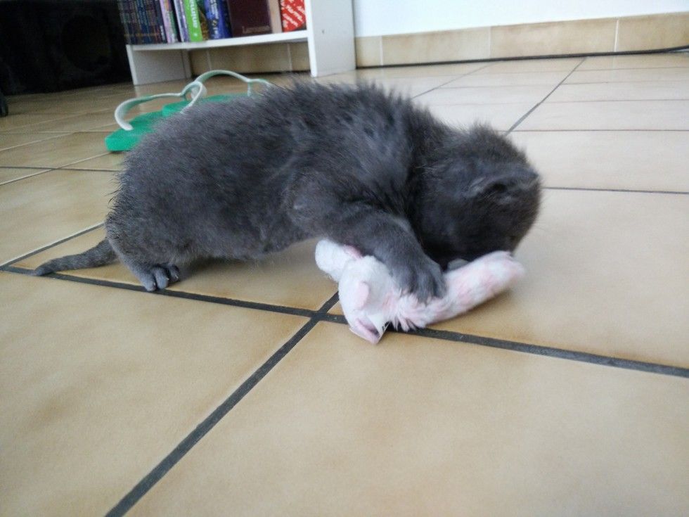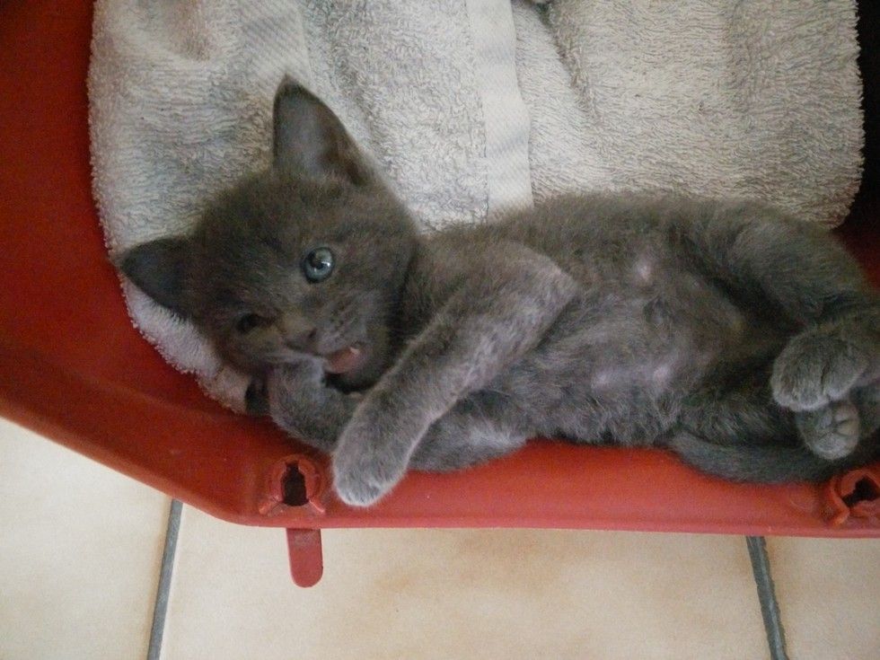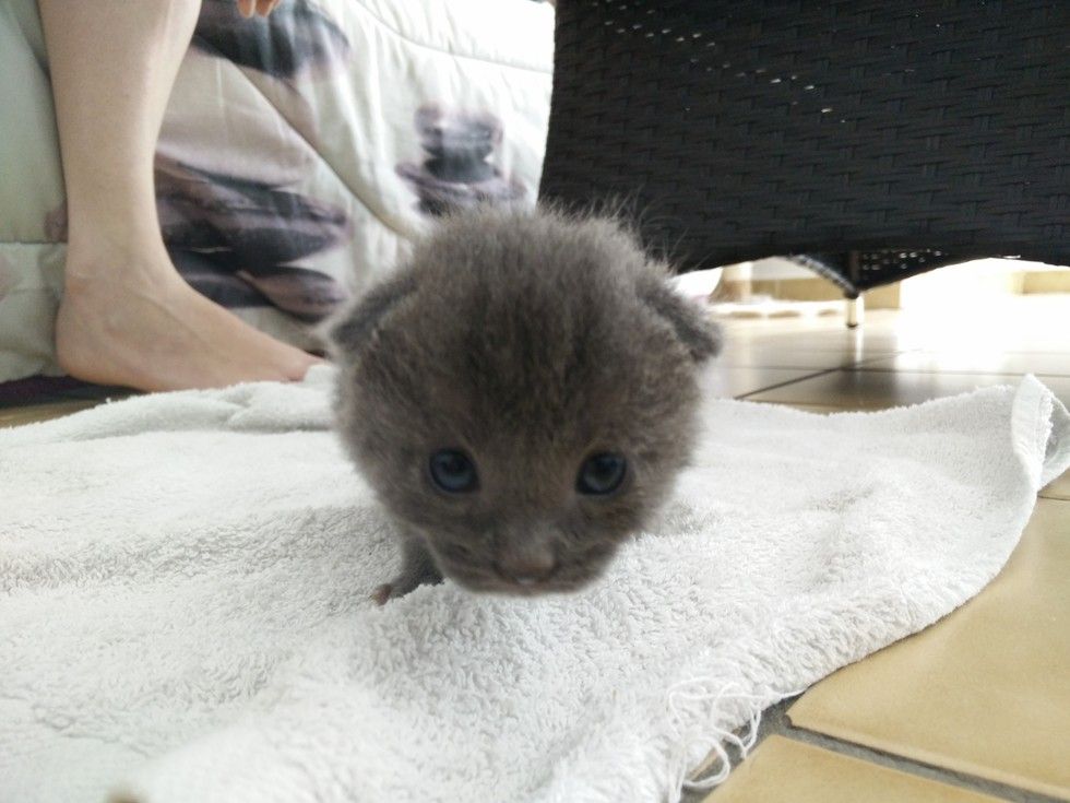A tiny blue kitten was found during a heat wave in France in the summer of 2015. A couple heard frantic meows coming from underneath a dumpster.
