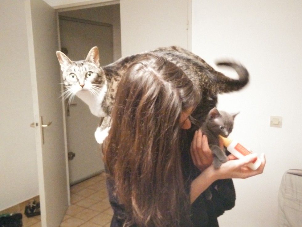 While the human mom is feeding little Horcruxe, her other cat Khajiit decides it's the perfect time to demand attention.