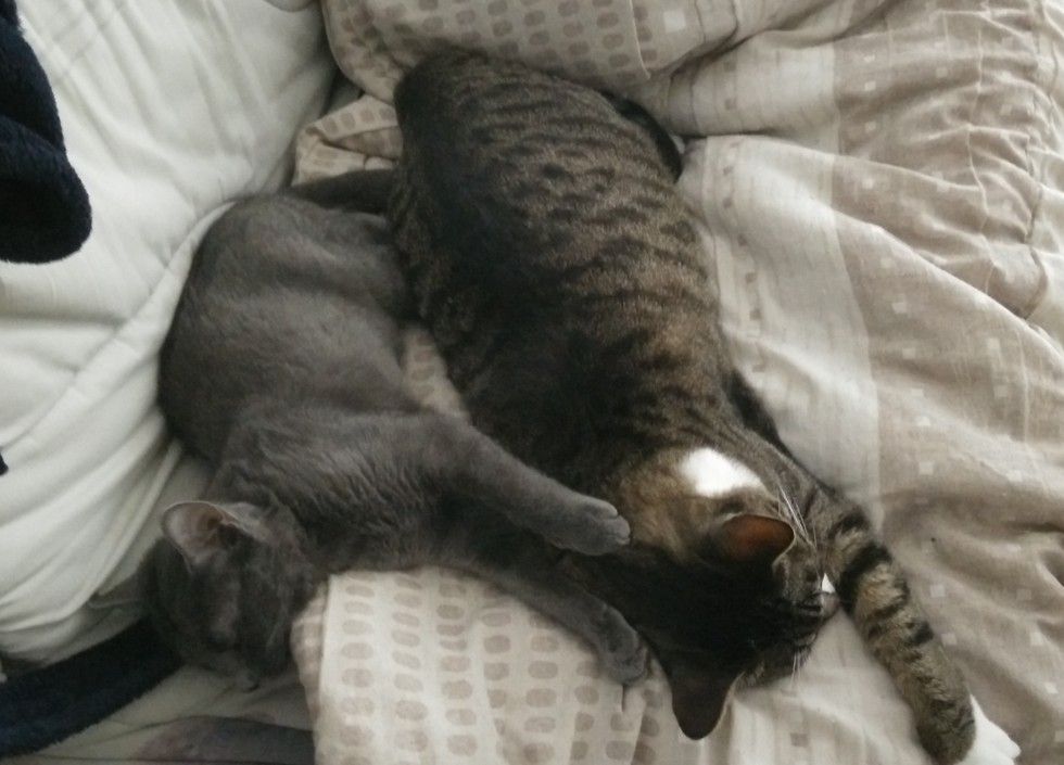 Snuggling with her best fur buddy at her forever home!