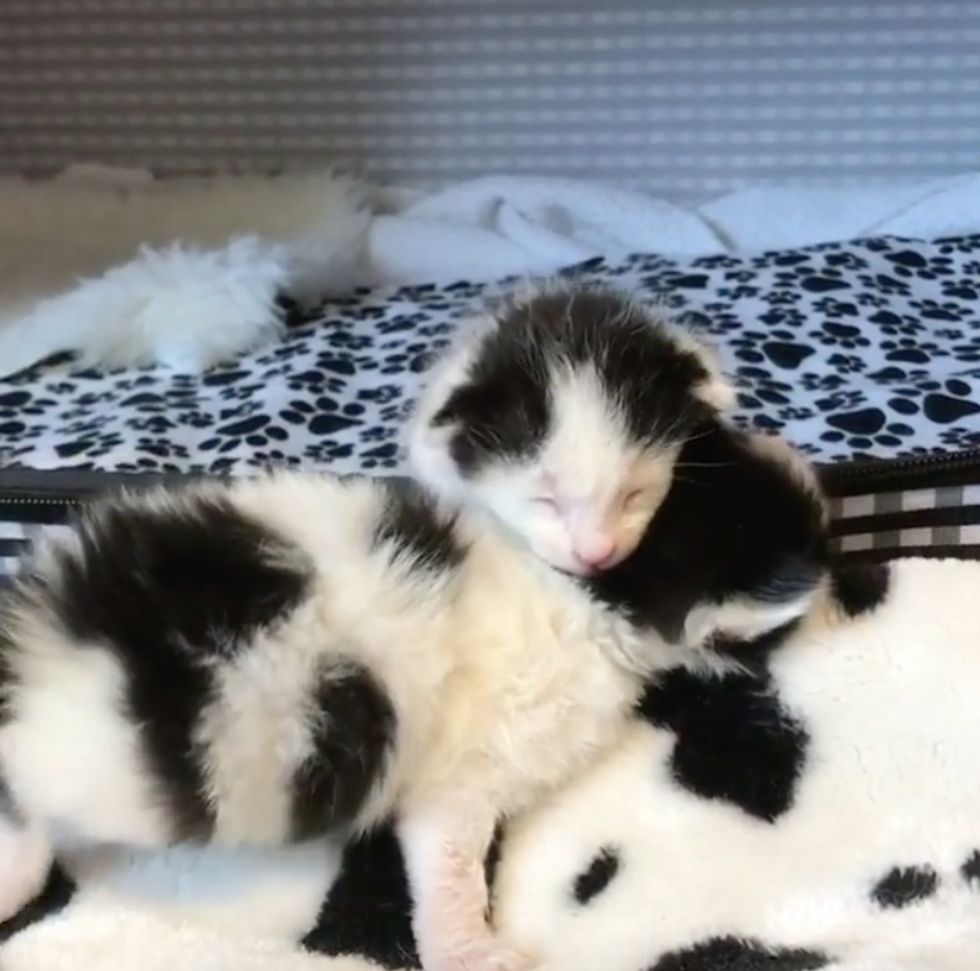 The tiny cow kitties love to pile up in a cuddle puddle and purr up a storm after every meal.