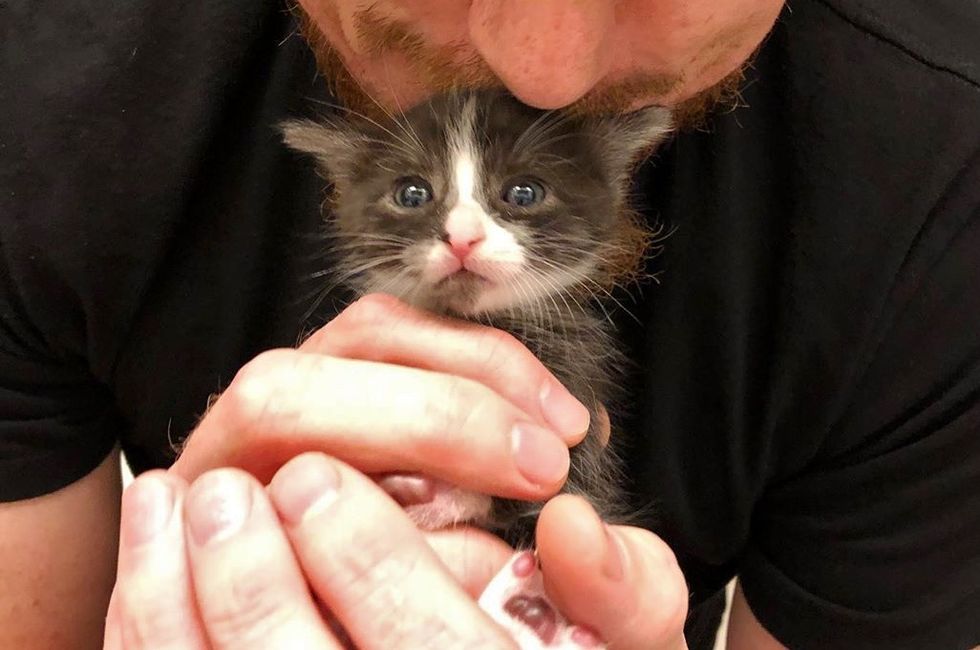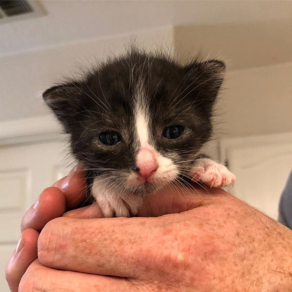 The tuxedo was just a few weeks old and covered in dust. As soon as he was picked up, he started waving his tiny mittens in the air, kneading in pure bliss. The little guy was eager for affection and attention.