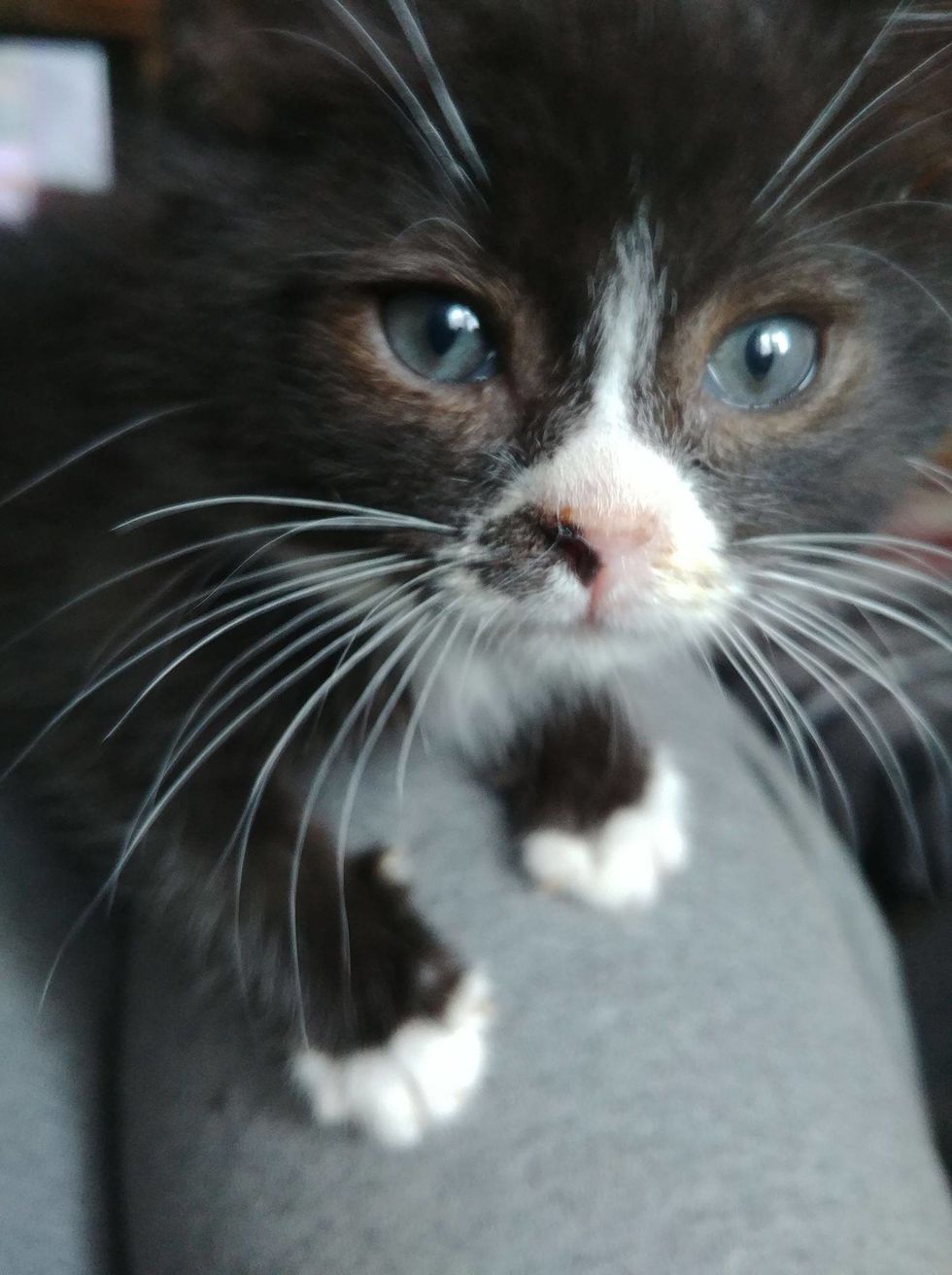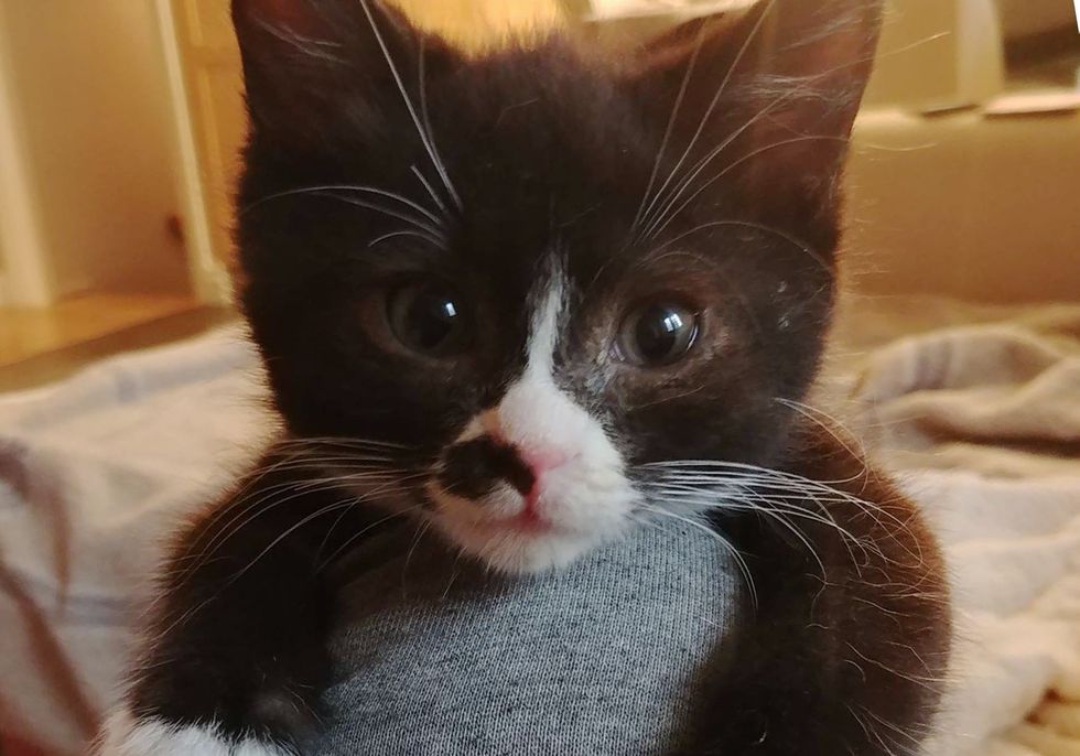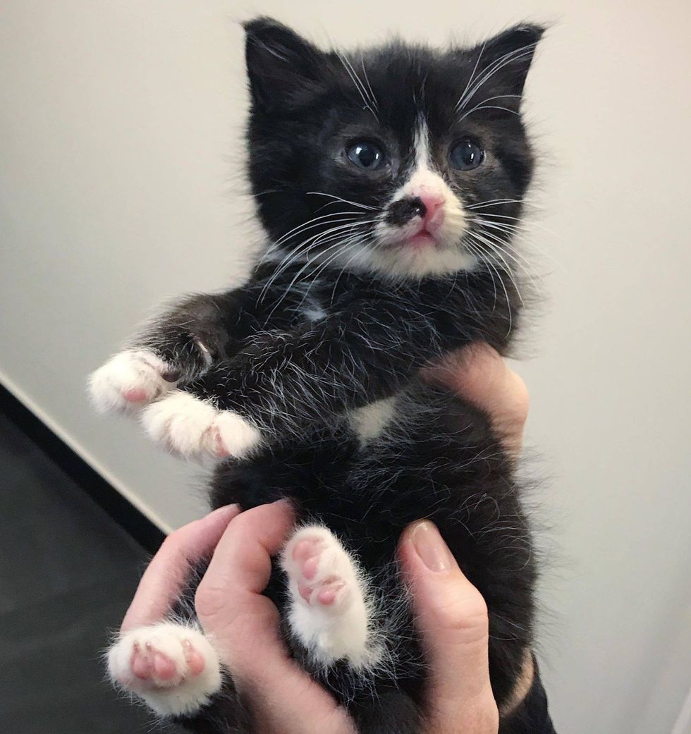 A tuxedo kitten was spotted wandering the streets without a mother in sight. He was in poor shape and taken to a pound where his fate became uncertain.