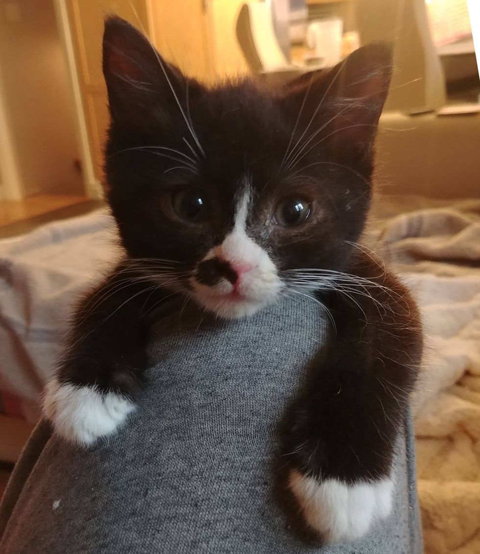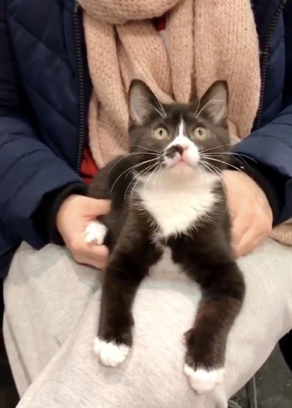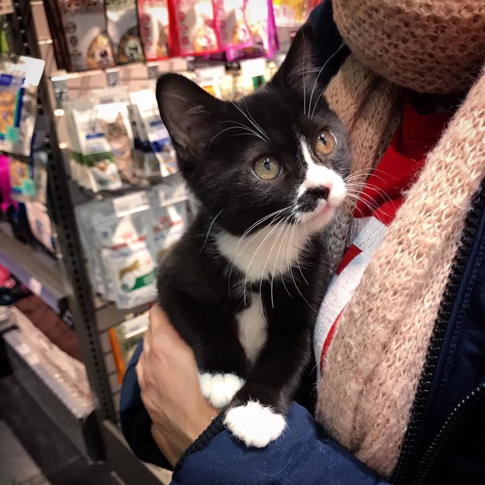 Jess, a foster volunteer of the rescue, came to pick him up. When she held him in her arms, the little tuxedo nuzzled right in and started purring.