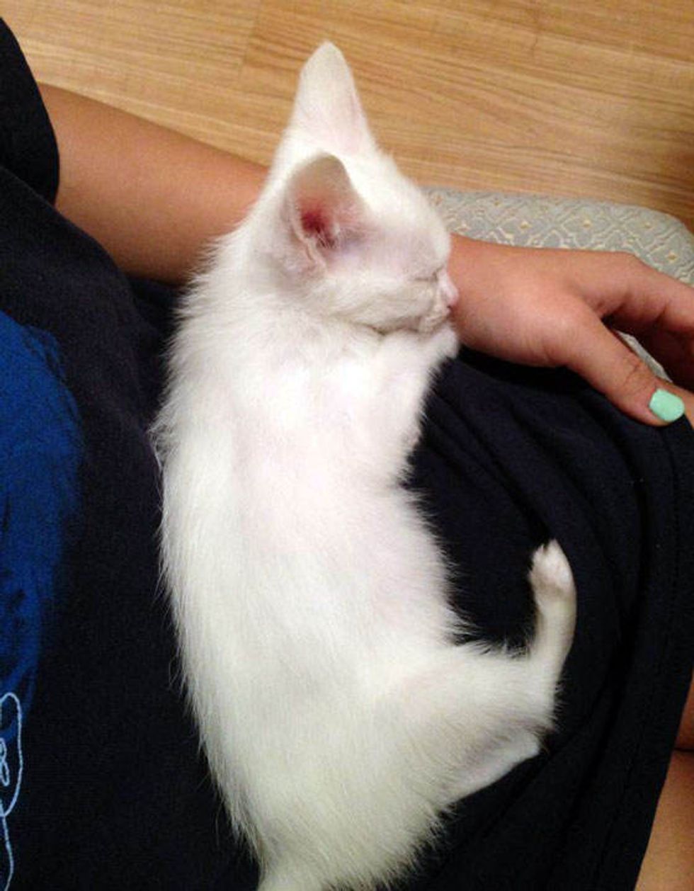"She was covered in dirt and cement residue. We honestly thought she was a grey/white striped cat when we first found her only to discover after her flea bath that she was pure white. And her ears were all pink and peeling from sunburn," the human wrote via reddit.