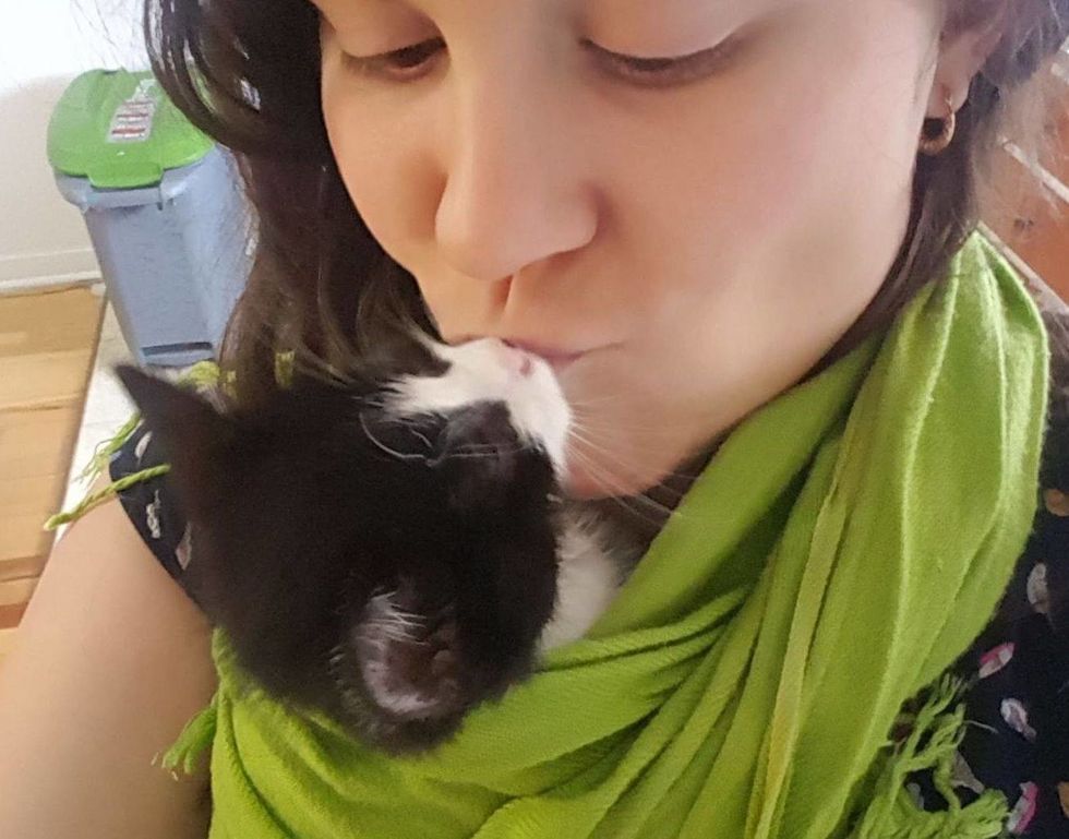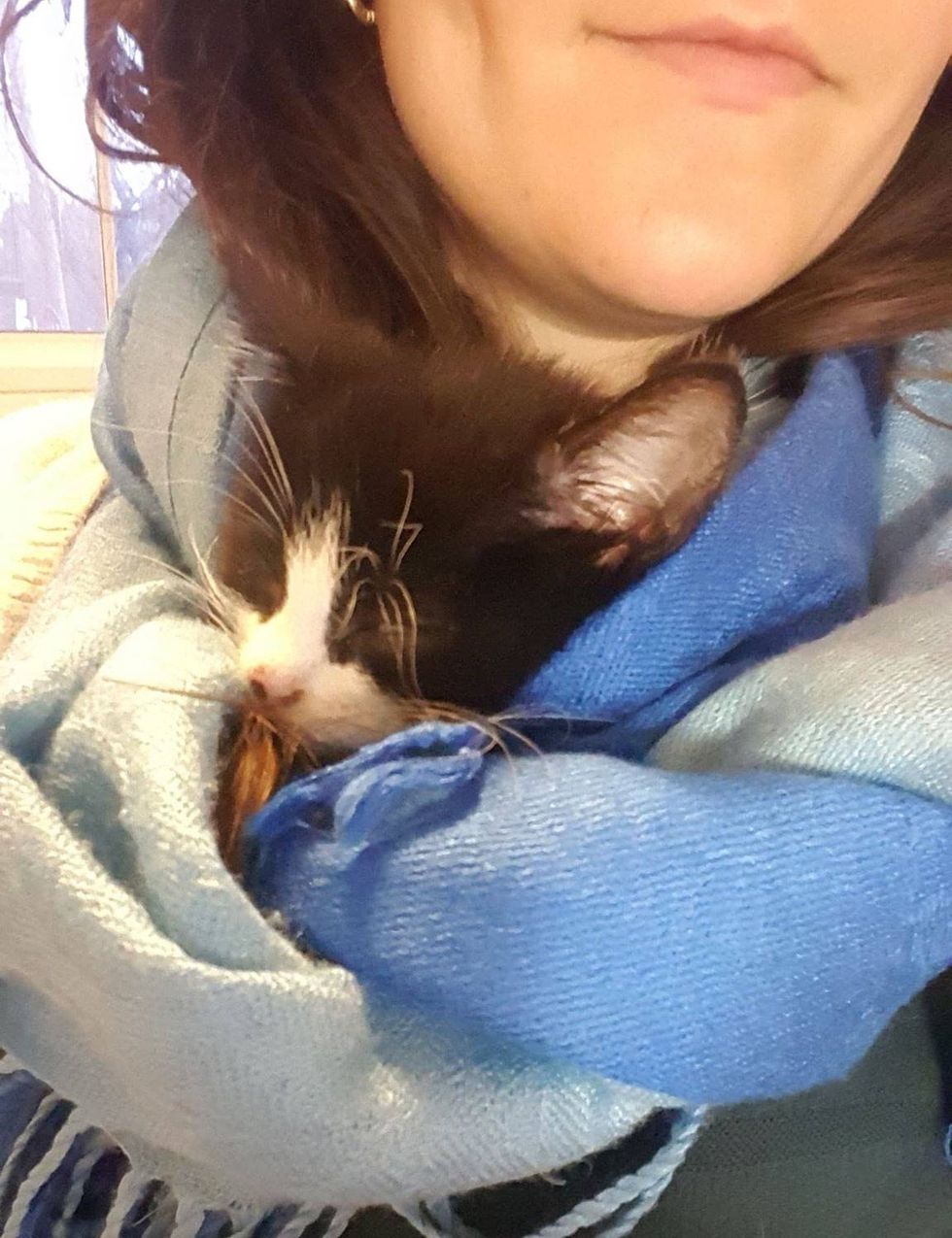 She cuddled with him in a purrito after every feeding, so the kitten could fall asleep feeling safe, loved and warm.