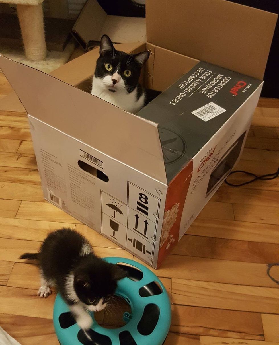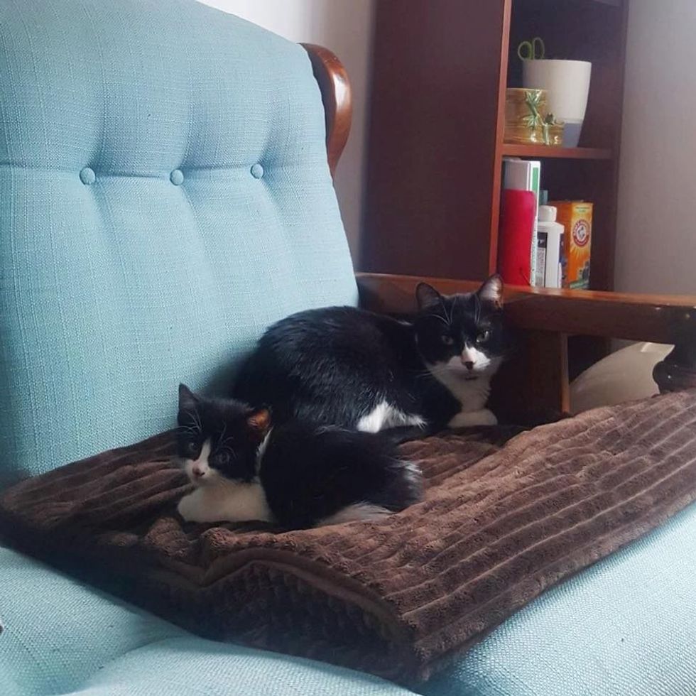 The tuxedo has really filled out since then. He's no longer just a bag of bones and has even grown a cute belly.