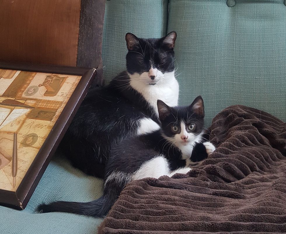 "Once he was well, Valerie's cat Zacky (also a tuxedo) came to take over the foster duties and started teaching him how to be a cat."