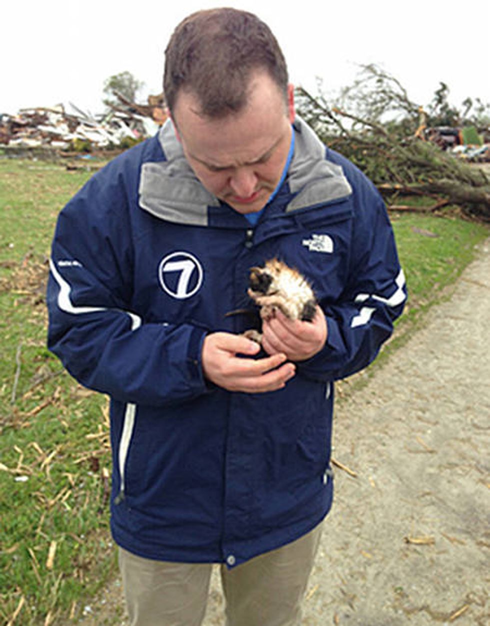 Meteorologist Rich Wirdzek rescued a tiny kitten while surveying the damage of homes destroyed by a tornado.