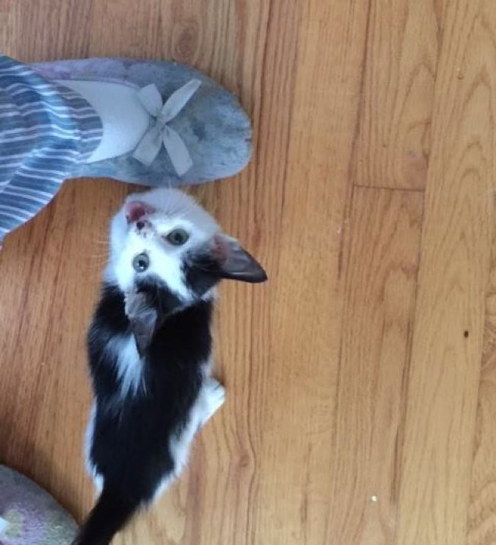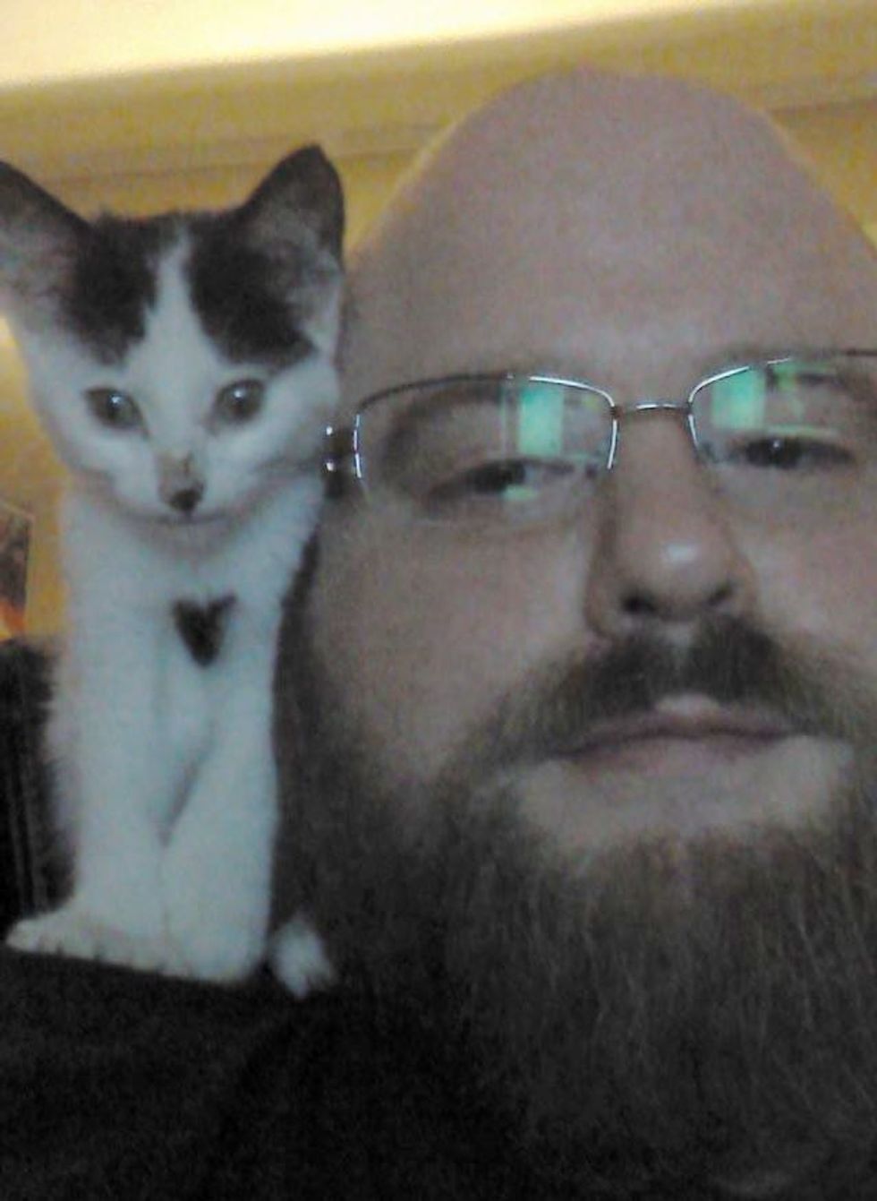 Kitten with a little heart on his chest found on a loading dock is now purring nonstop with the person who rescued him.