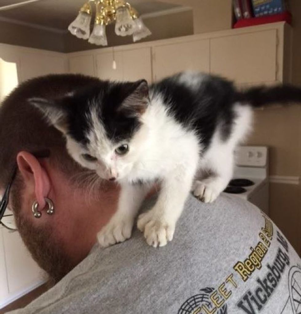 Duncan Cameron shares the story with Love Meow: "He wandered onto the loading dock at my job last week, completely starved and in rough shape. When he wandered in, I knew the little guy desperately needed a home. So I called my wife, got her blessing and immediately took him home.
