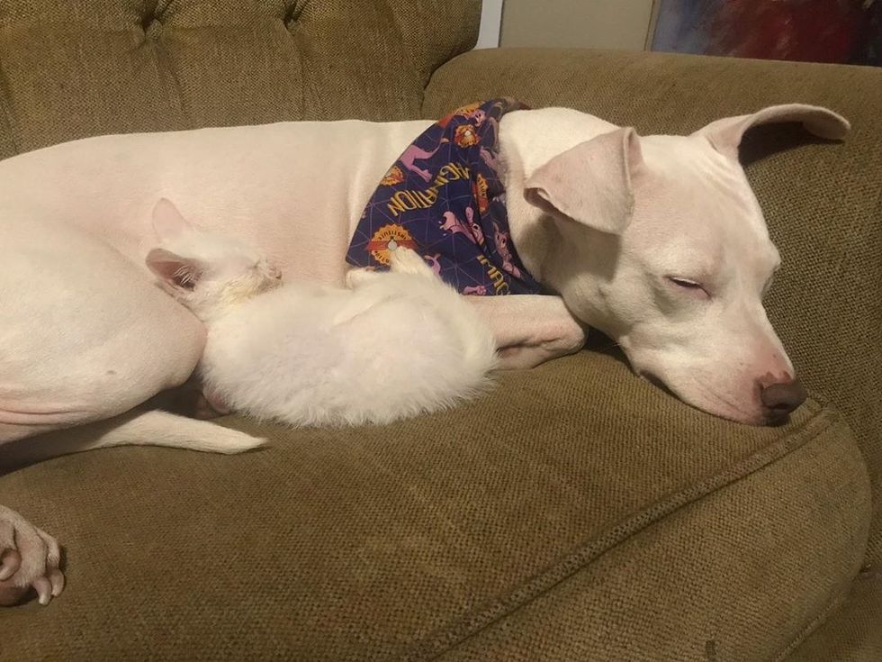 A rescued kitten who was half the size he should be, found a canine friend to cuddle.