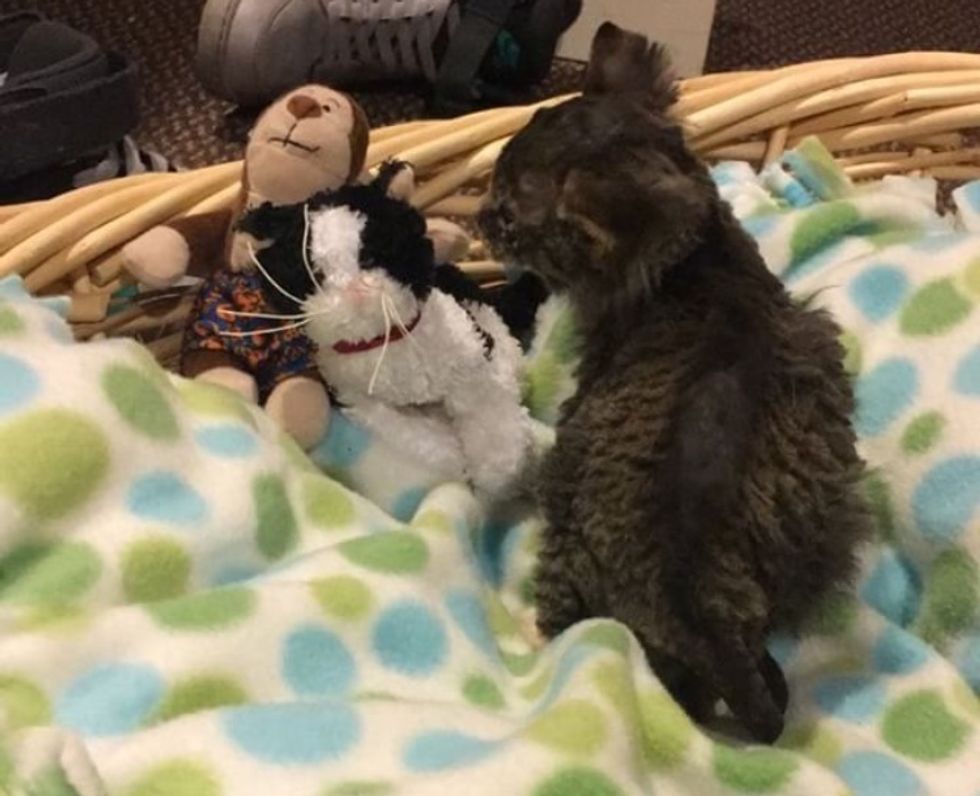 First day home. His ears were burned and there were sores on his tail, but the little guy was so grateful to have a home and toys to cuddle with.
