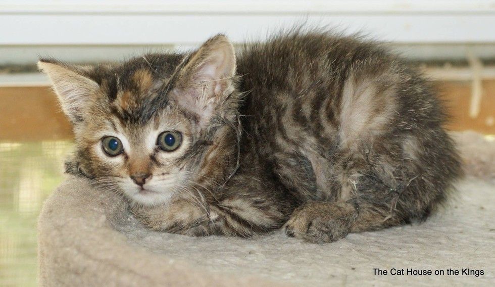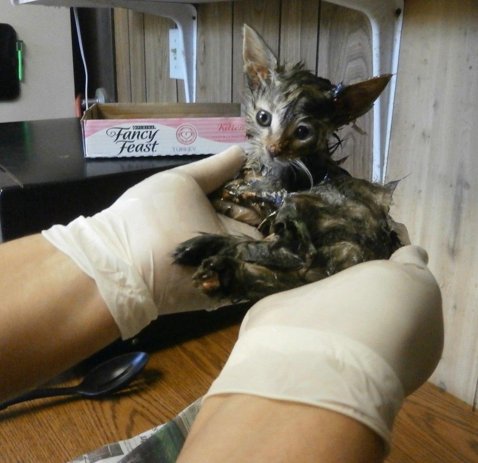 This sweet little kitten was brought to the Cat House on the Kings (in Parlier, California) covered in glue from those sticky mousetraps.