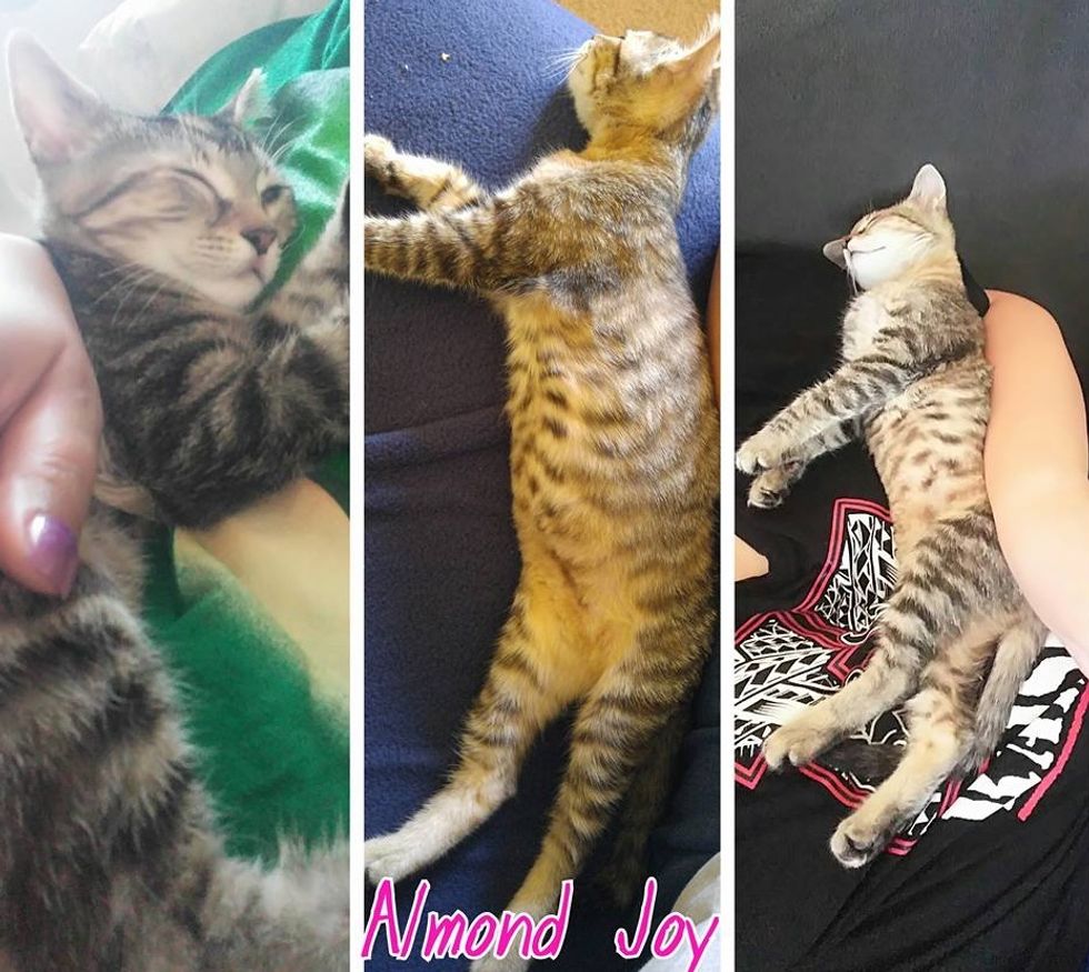 Little Almond Joy was saved from a "sticky" situation, and turned around by love. She hasn't stopped purring since the day they took her in.