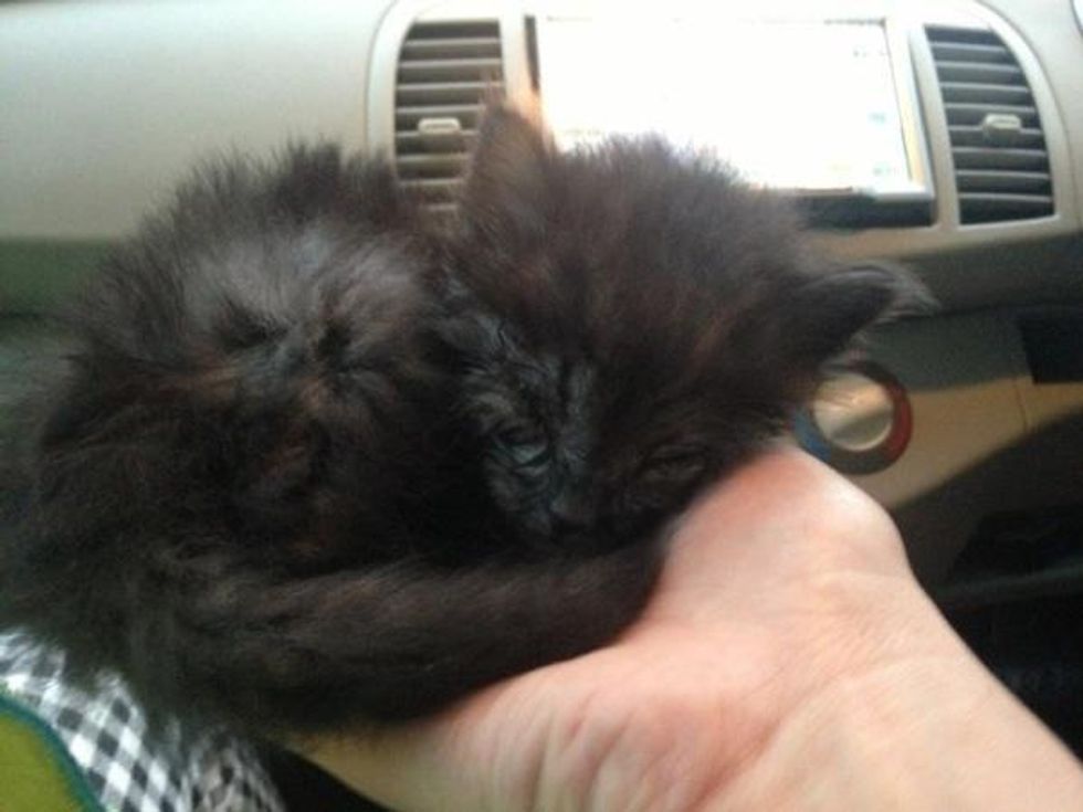 They scooped him up and wiped off the dirt on his coat. The kitten snuggled in his rescuer's hand for a nap and that much-needed TLC.