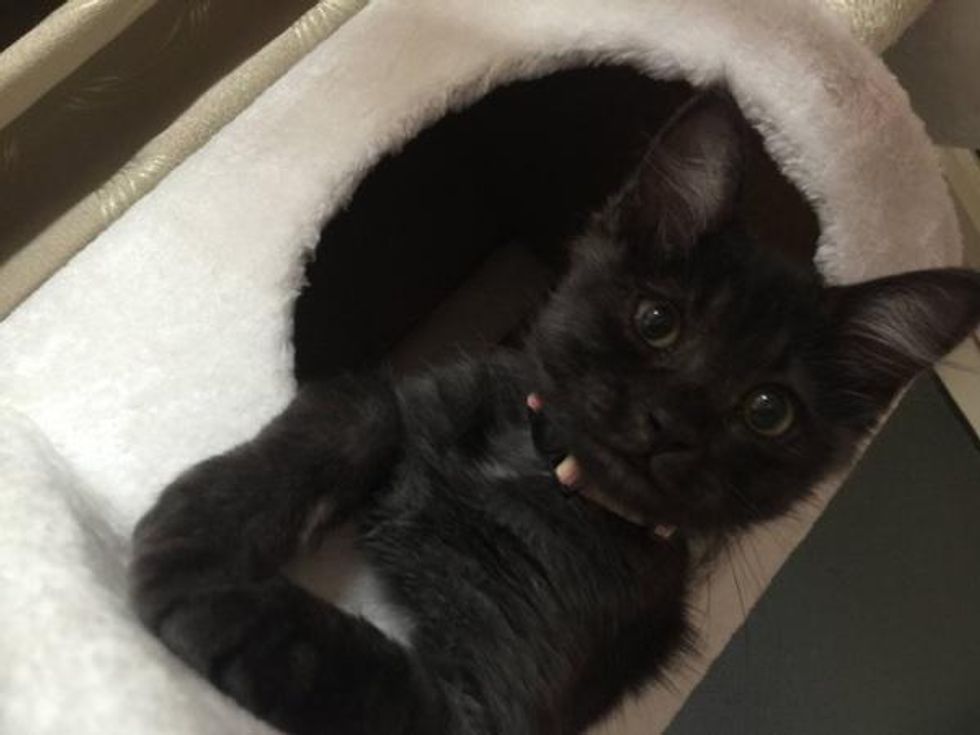 He was a sickly little kitten but with a lot of love through many sleepless nights, they nursed the little guy back to health.
